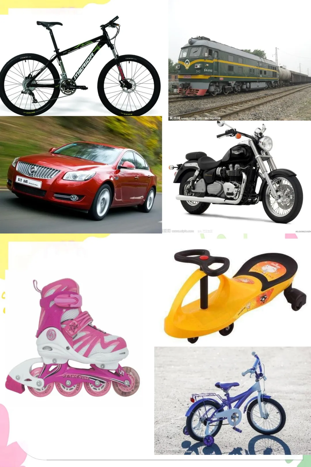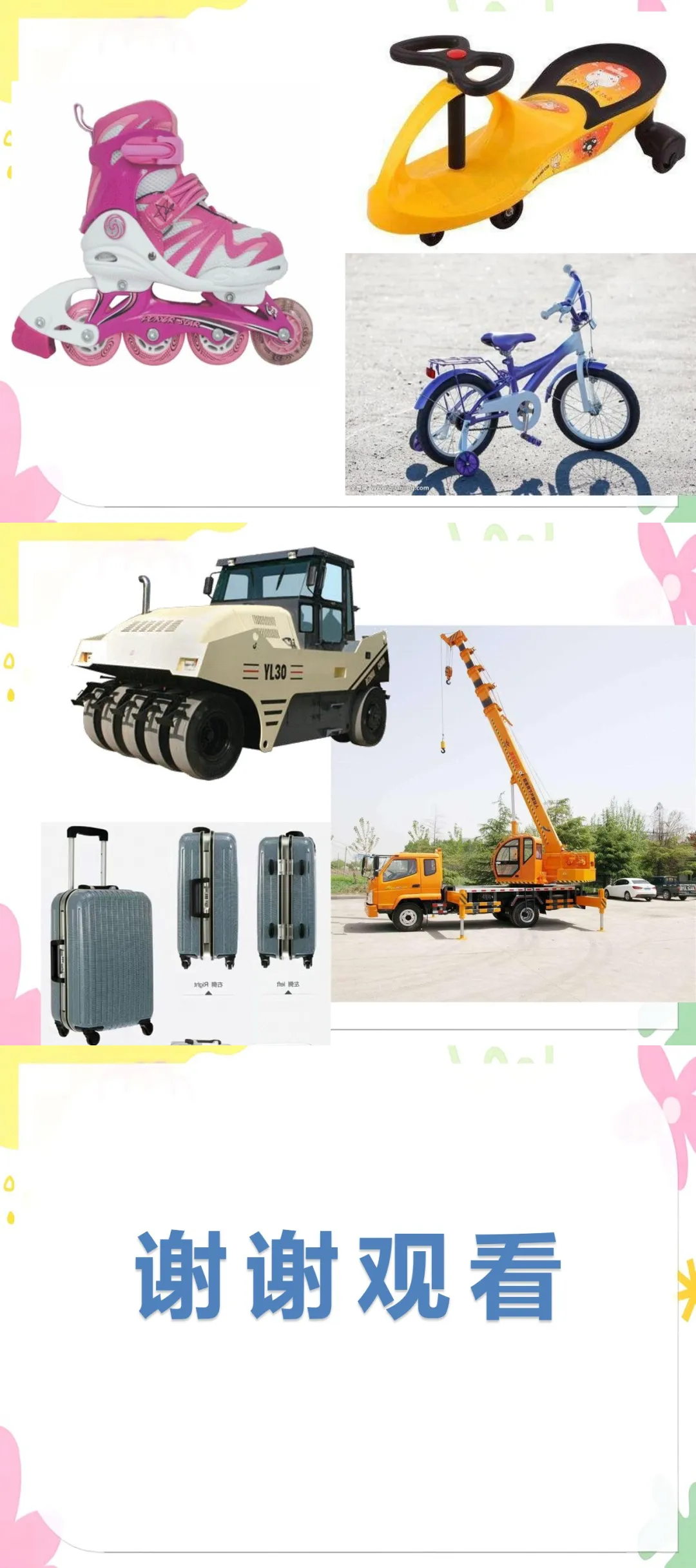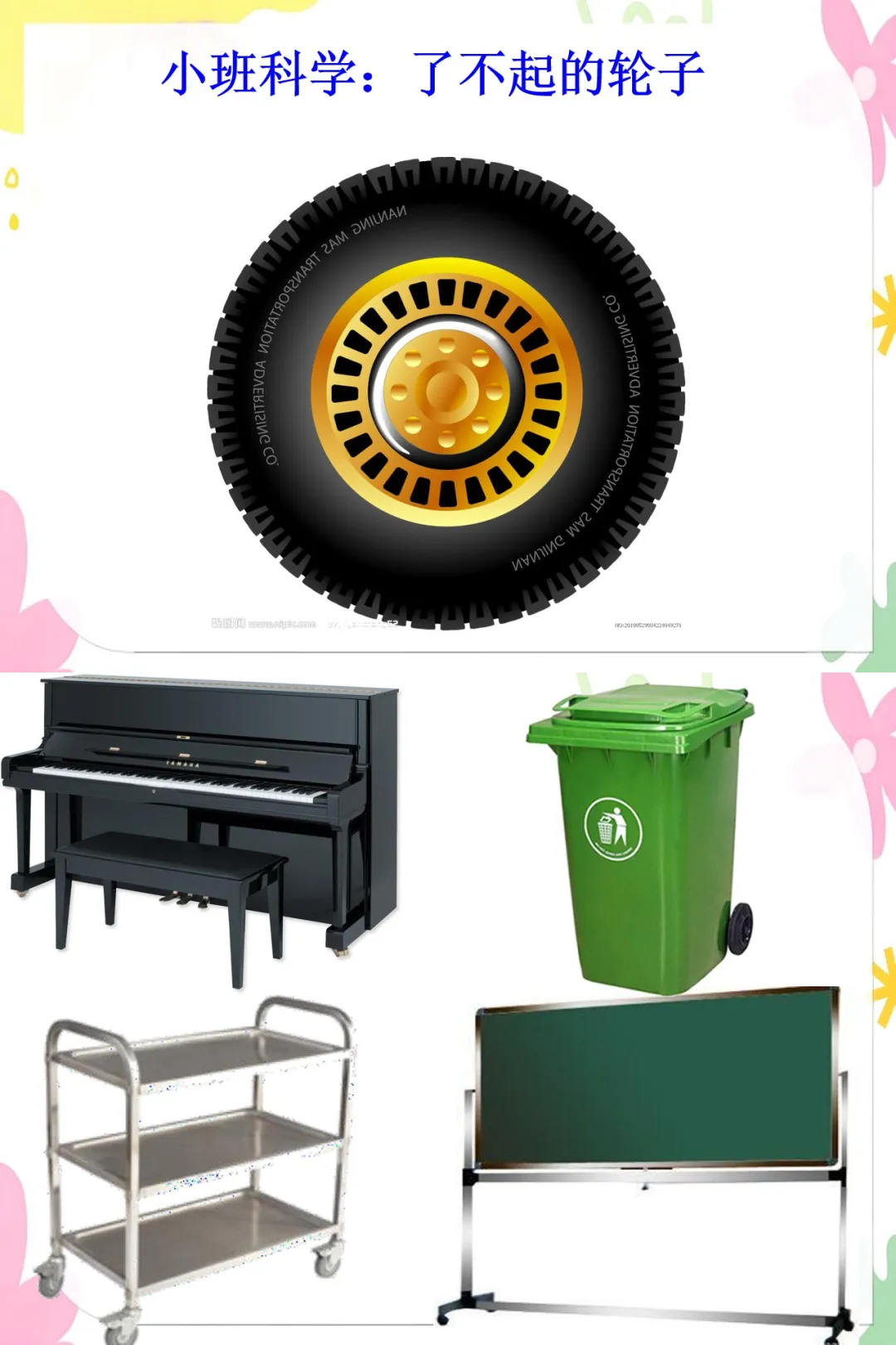 3.ppt:各种带轮子的物体图片,如钢琴、购物车、轮椅、火车、飞机等。