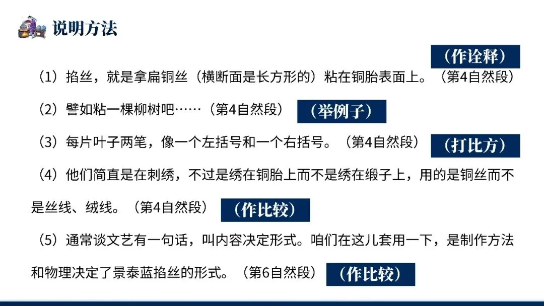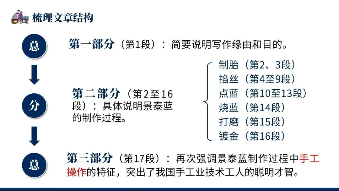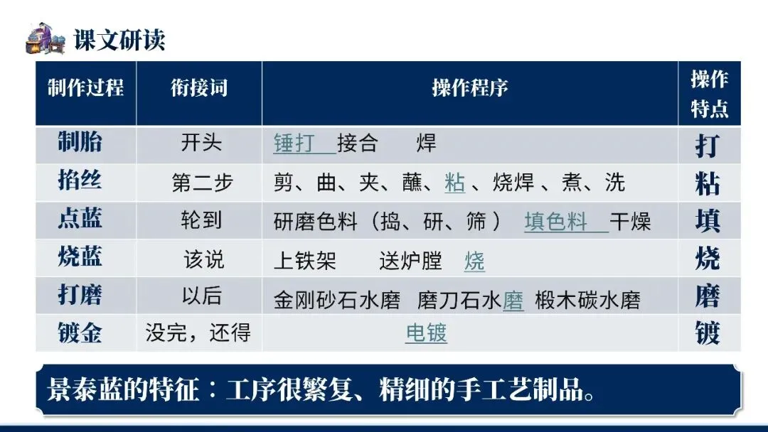 本文是叶圣陶的说明文名篇。文章以景泰蓝制作流程为说明对象,按照制胎、掐丝、点蓝、烧蓝、打磨、镀金六道工序依次介绍,详略得当地突出"掐丝"与"点蓝"两道关键工序。全文综合运用下定义、举例子、打比方等说明方法,语言准确平实,条理清晰,既展现了传统手工艺的精湛技艺,又体现了作者对工匠劳动的尊重,是说明文写作的典范。