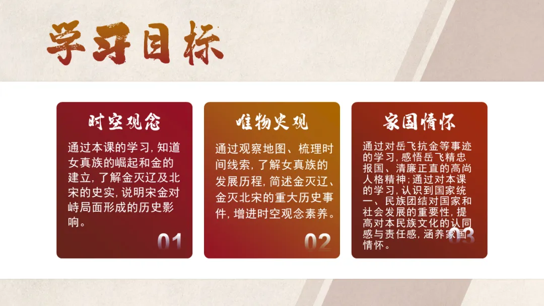 通过本课的学习,知道女真族的崛起和金的建立,了解金灭辽及北宋的史实,说明宋金对峙局面形成的历史影响。