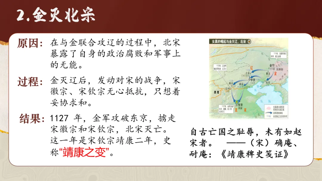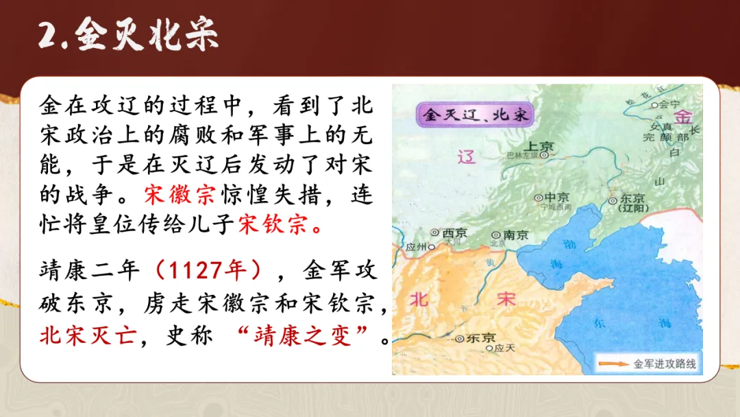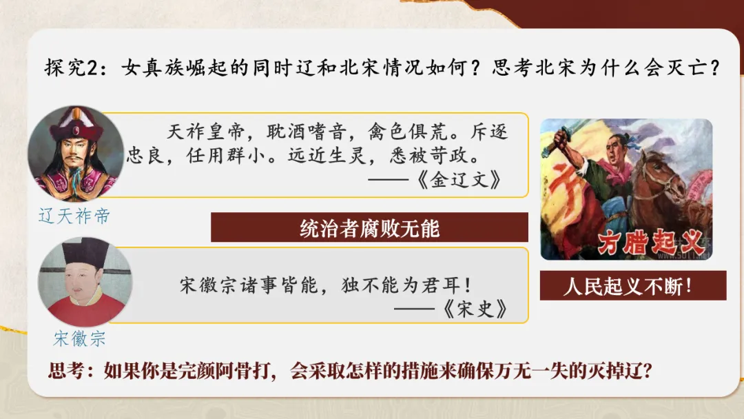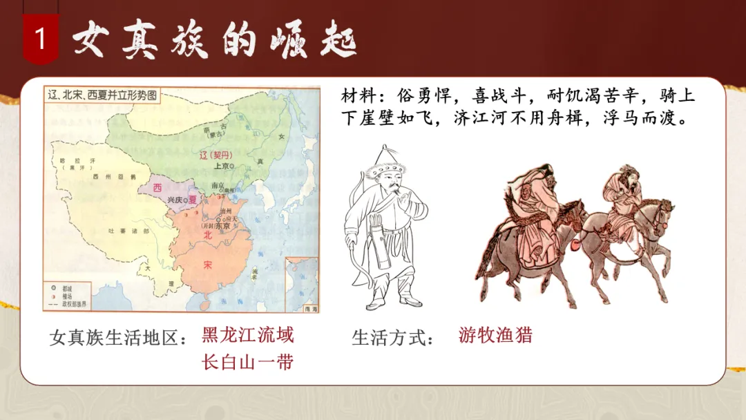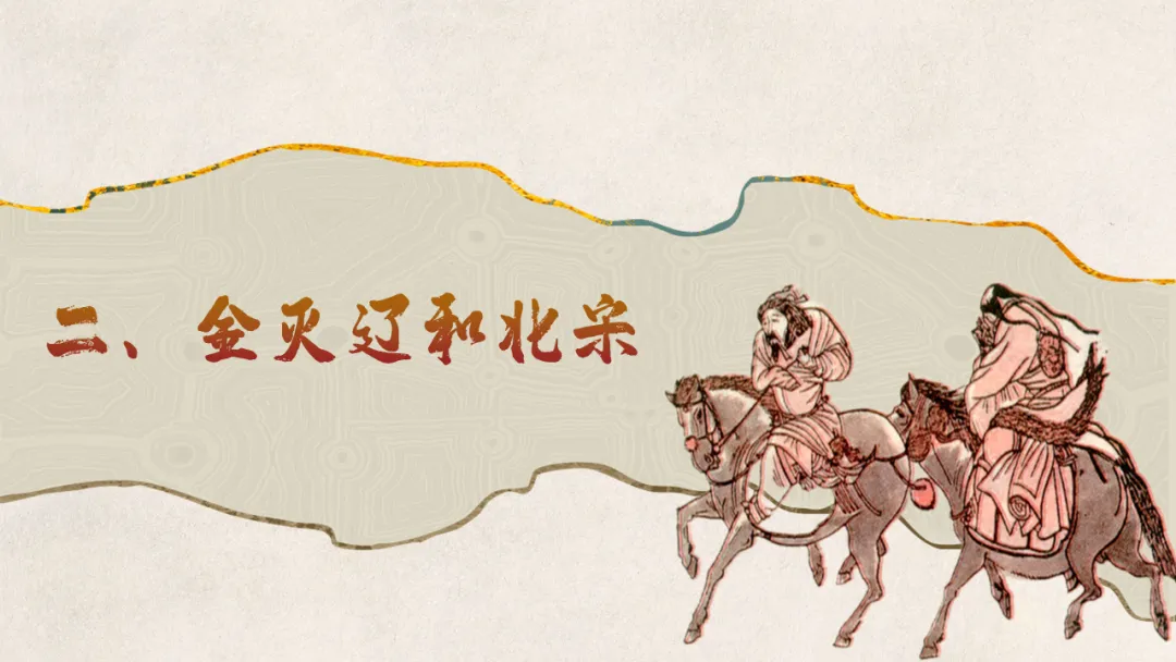 通过观察地图、梳理时间线索,了解女真族的发展历程,简述金灭辽、金灭北宋的重大历史事件,增进时空观念素养