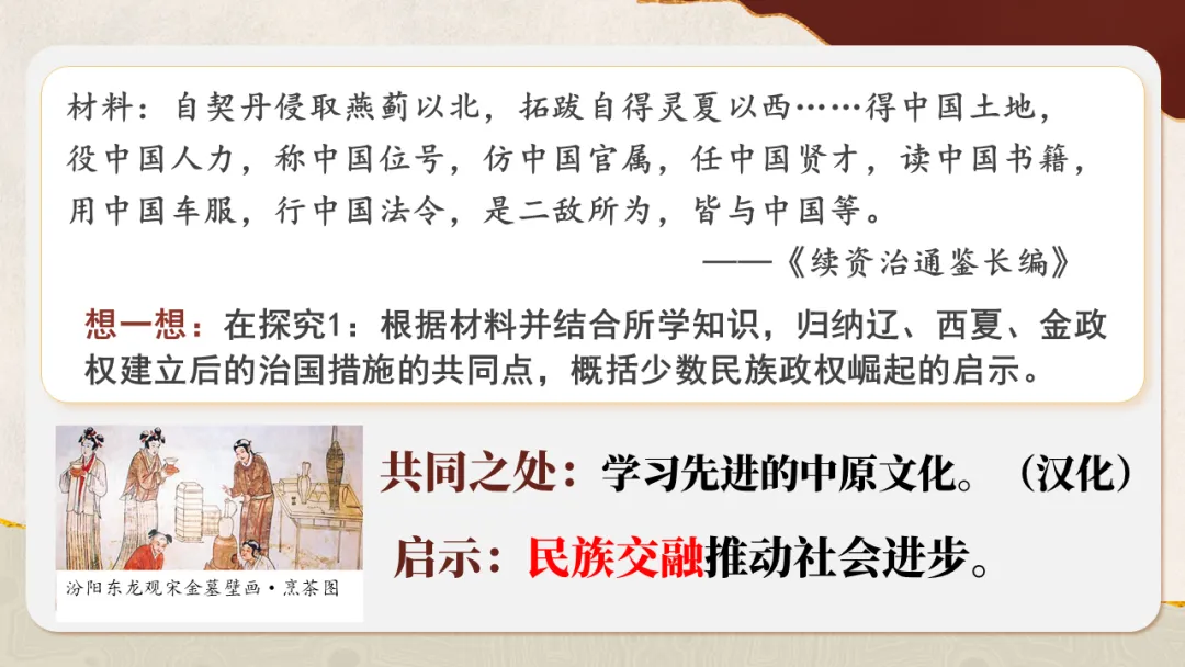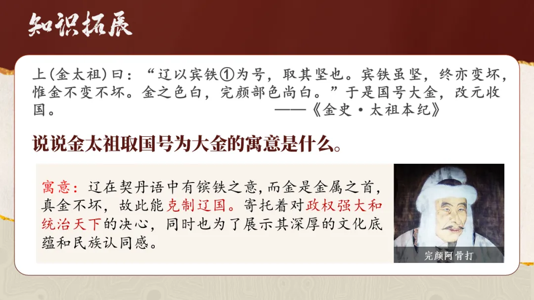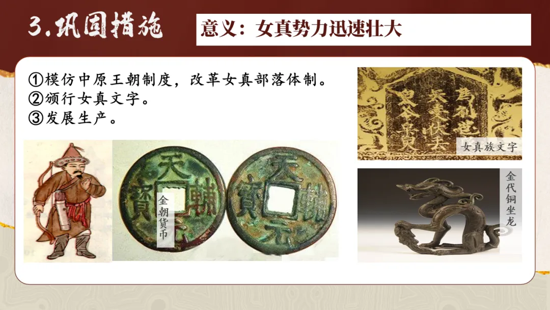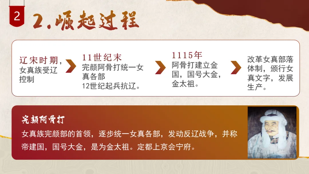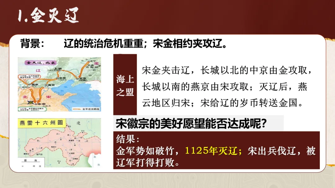通过观察地图、梳理时间线索,了解女真族的发展历程,简述金灭辽、金灭北宋的重大历史事件,增进时空观念素养