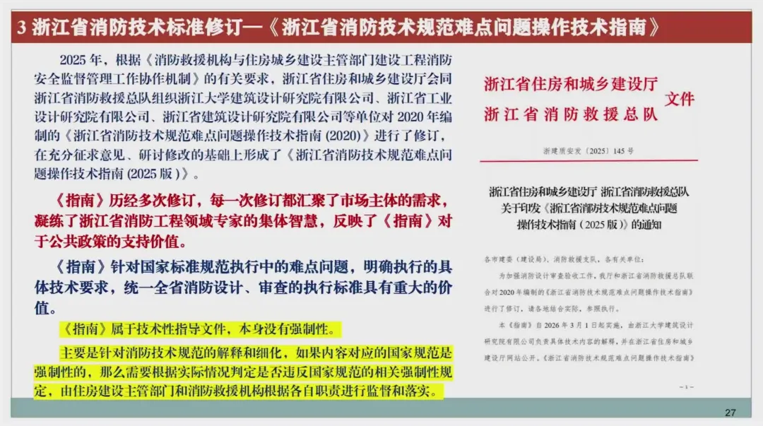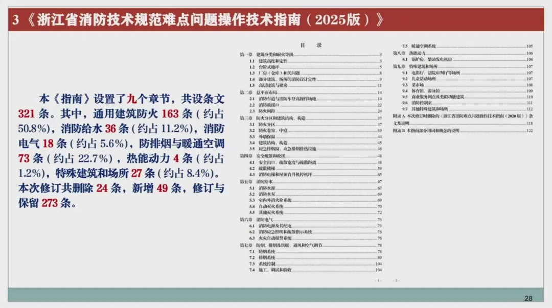 浙江省住建厅、浙江省消防总队联合印发的《浙江省消防技术规范难点问题操作技术指南 (2025 版)》(浙建质安发〔2025〕145 号),已于2026年3月1日起正式实施,是当前浙江省内消防设计、审查、验收全流程的核心实操指引。《浙江指南》(2025修订版)理念先进,技术前沿,内容翔实,广受业界好评。