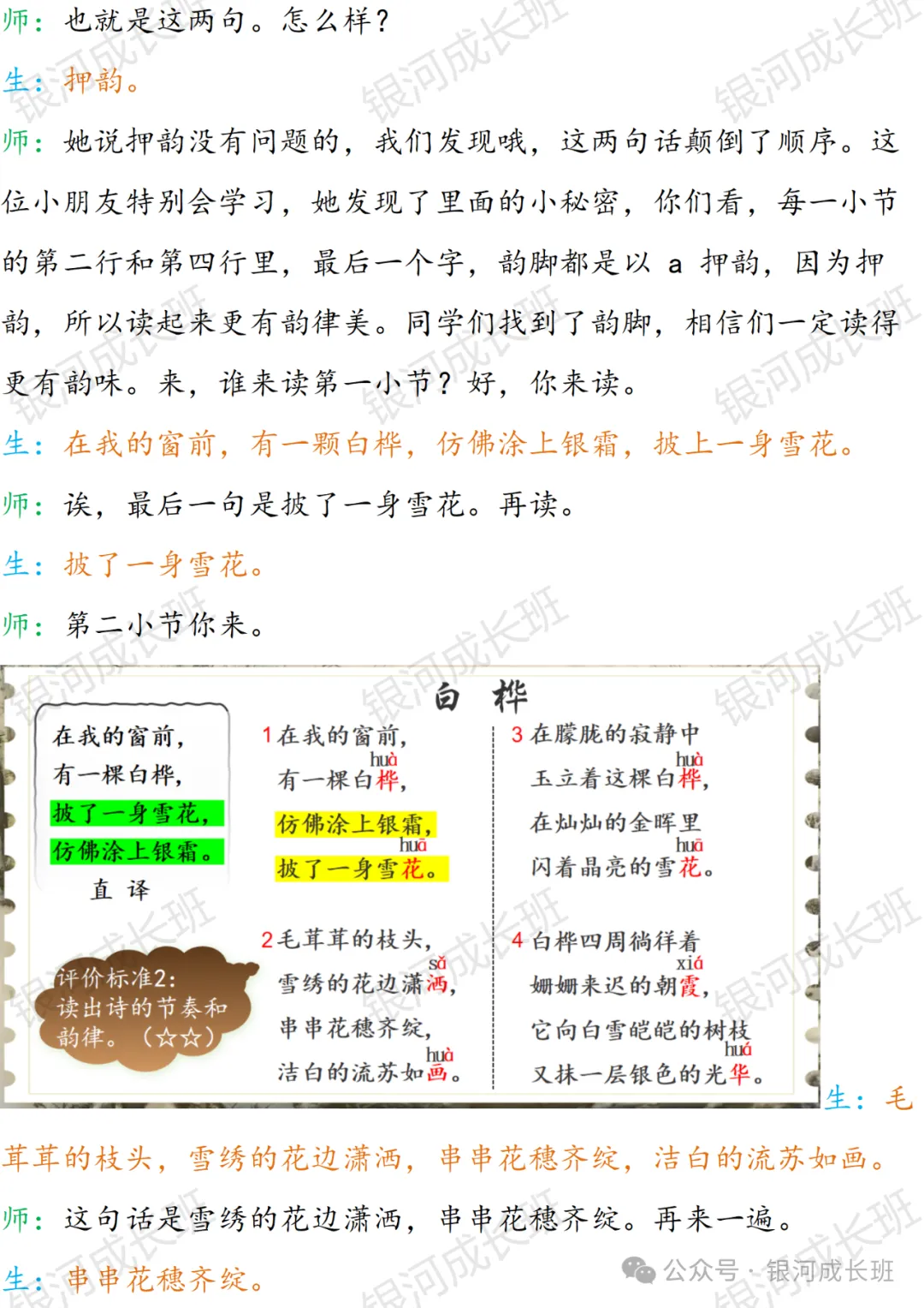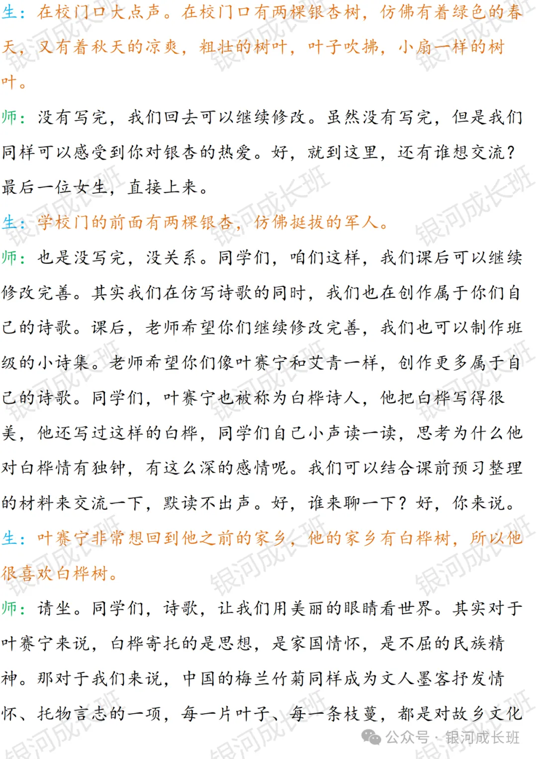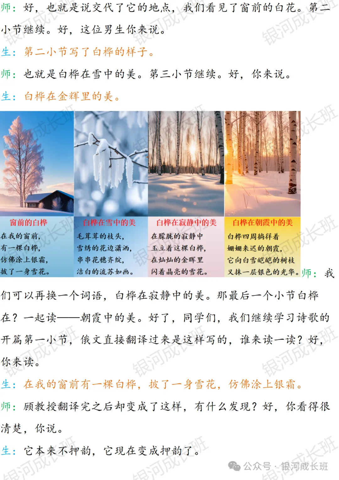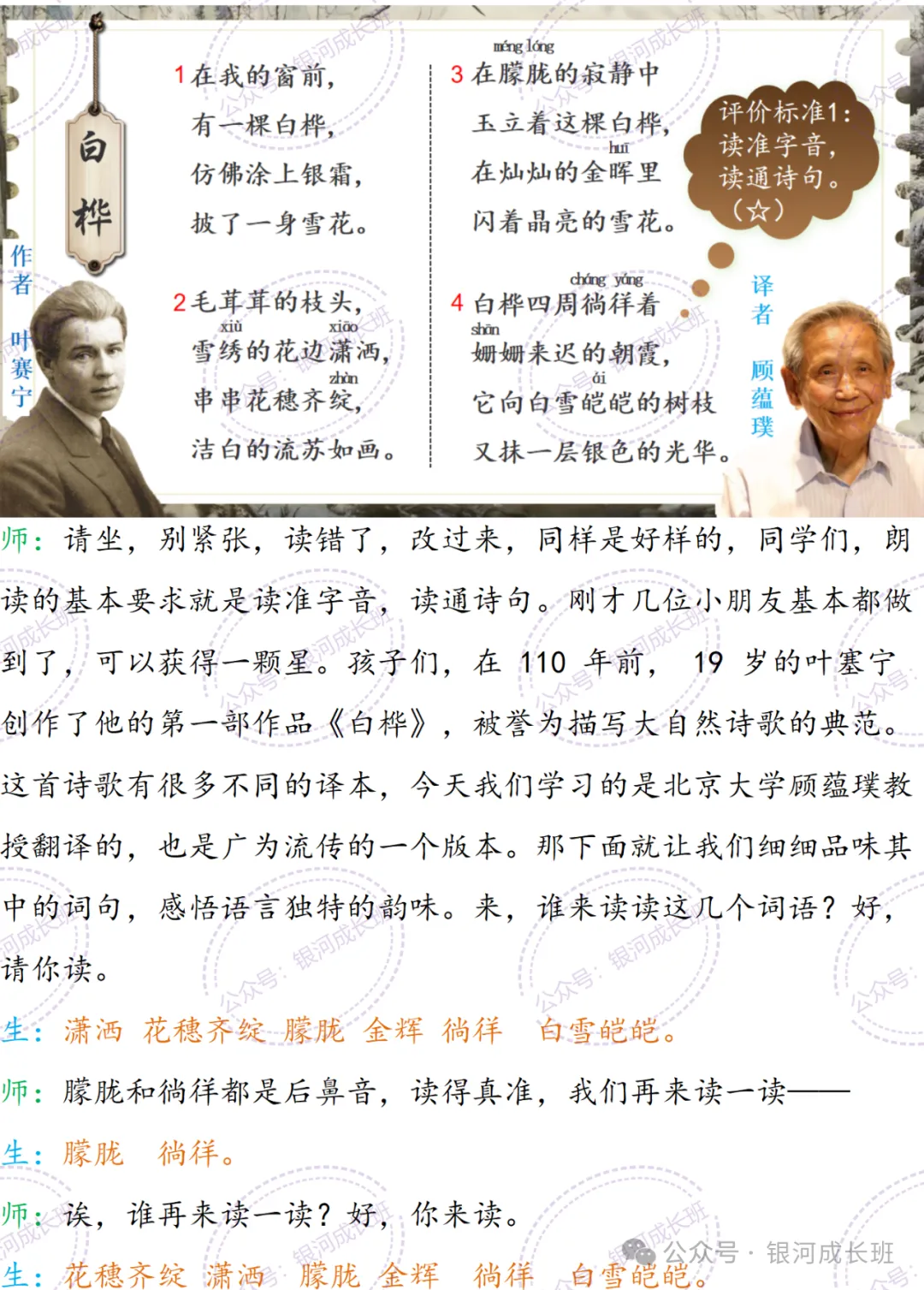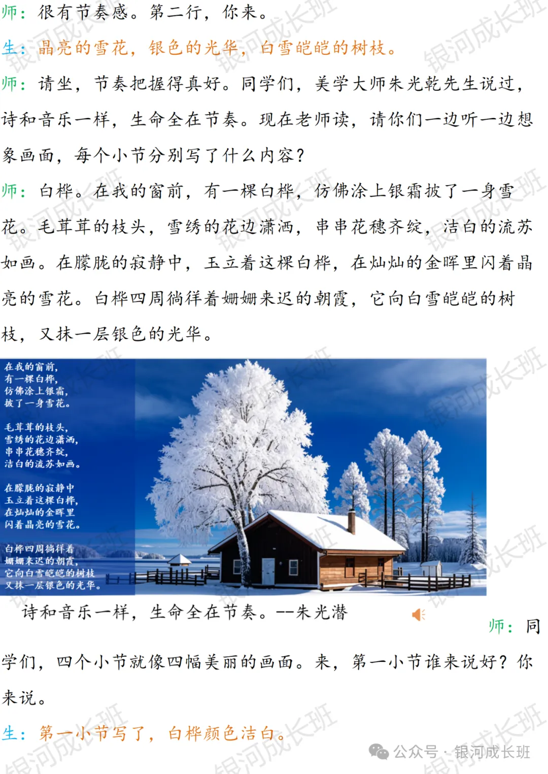 《白桦》一课通过想象画面、分析意象(如“雪绣的花边”“串串花穗”)、对比不同译本的语言特点,引导学生感受白桦的形态美与意境美。教师引用朱光潜的“诗与音乐一样,生命全在节奏”,提升了学生的审美感知力。