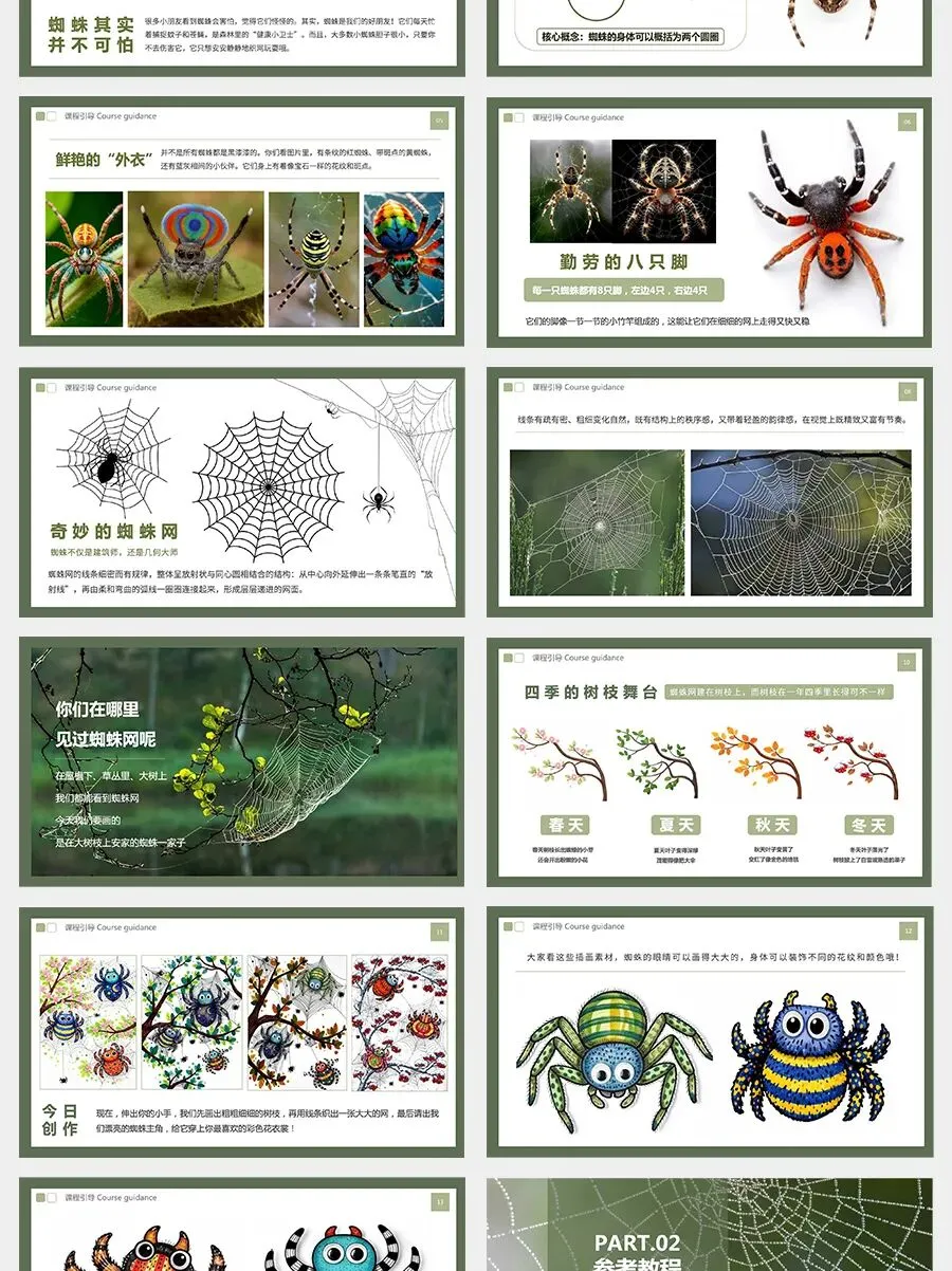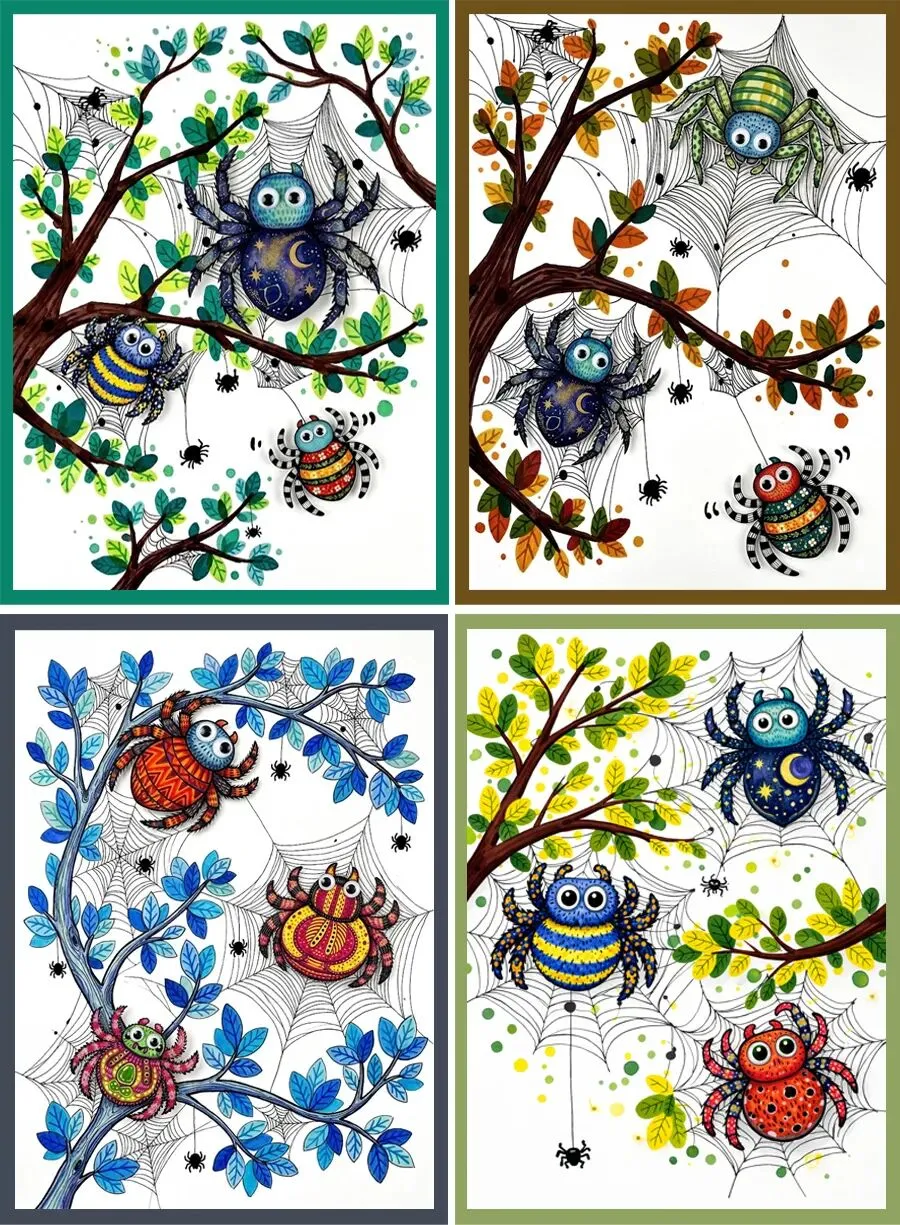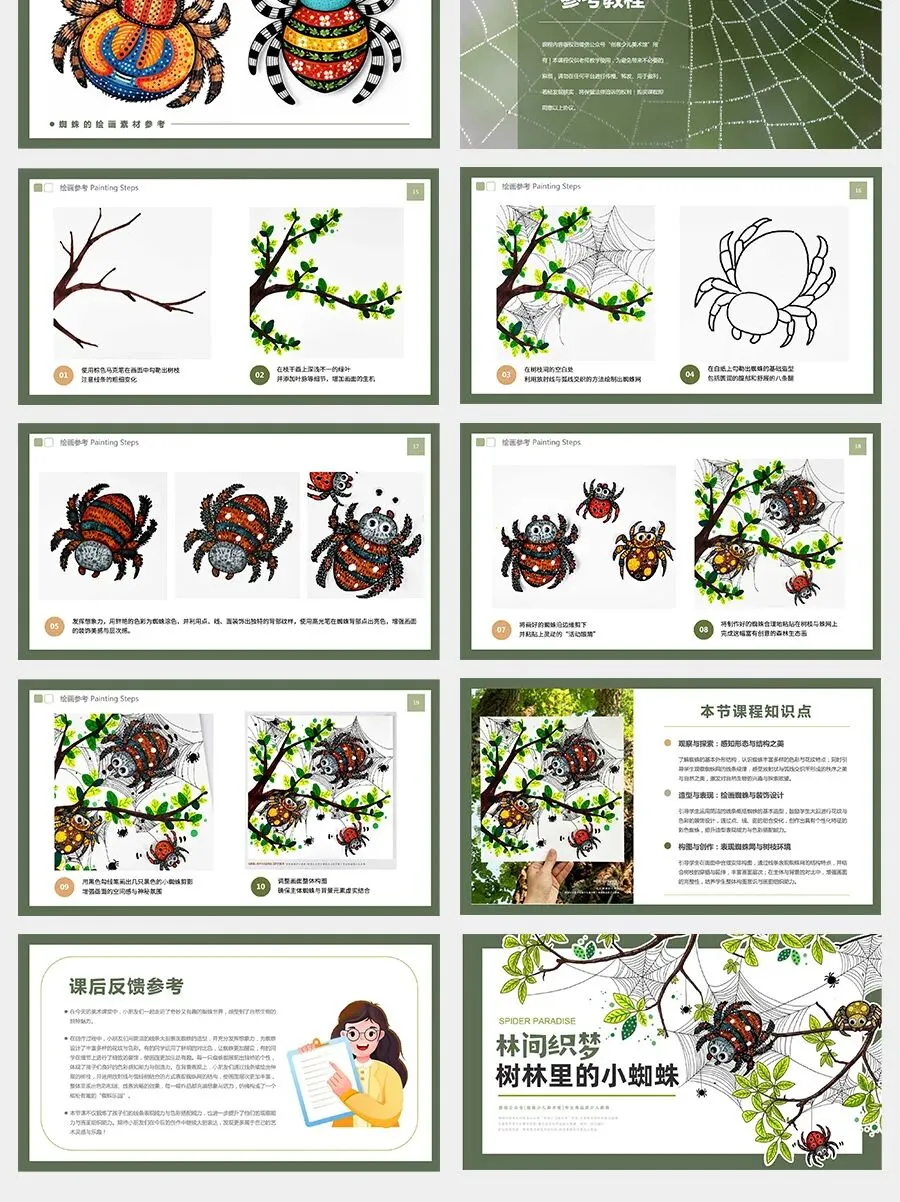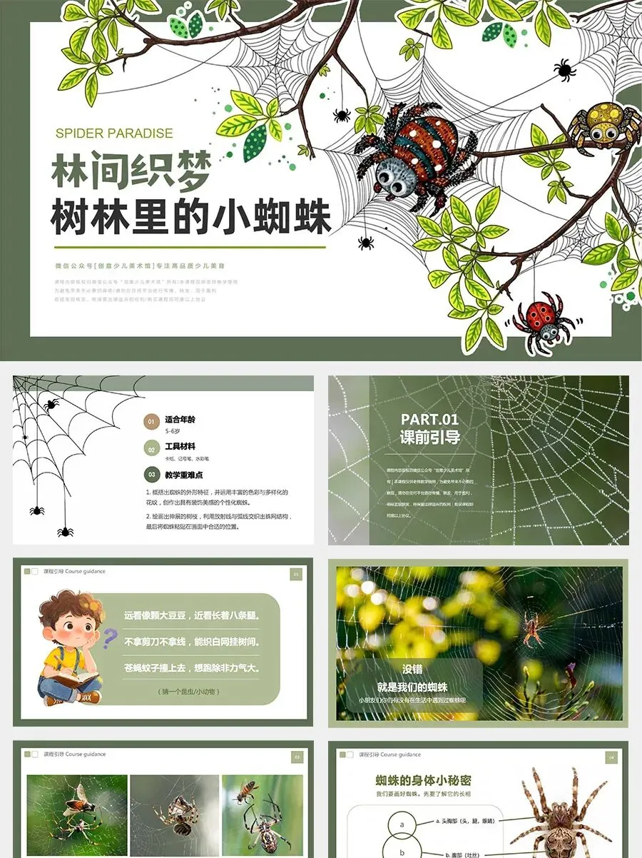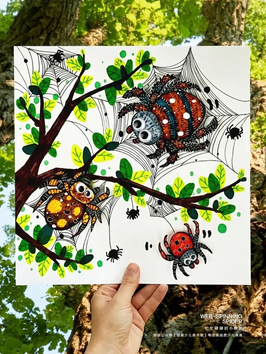 今天,就让我们也来当一回“小小织网大师”吧!在树枝之间画出一张晶莹剔透的大蜘蛛网,再为它设计几只可爱的蜘蛛——给它们画上大大的眼睛,设计独一无二的花纹和颜色!准备好了吗?一起走进神奇又有趣的蜘蛛世界吧!