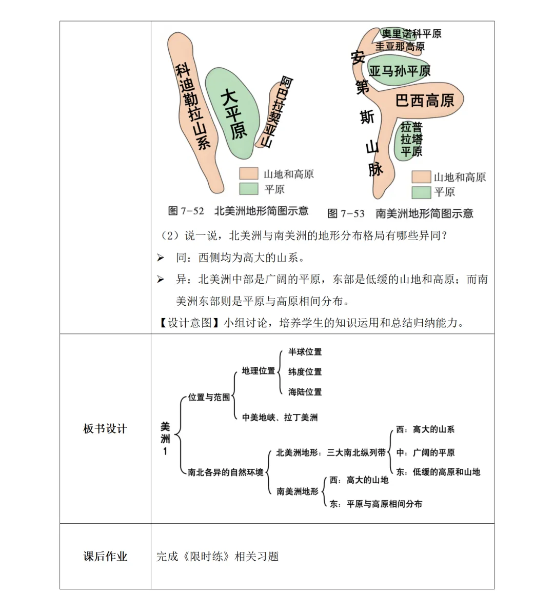 设计小组活动对比二者地形异同:相同点是西侧均为高大山系;不同点在于北美洲中部为广阔平原、东部低缓山地高原,南美洲东部平原与高原相间分布。通过对比深化记忆,培养综合思维与知识迁移能力。