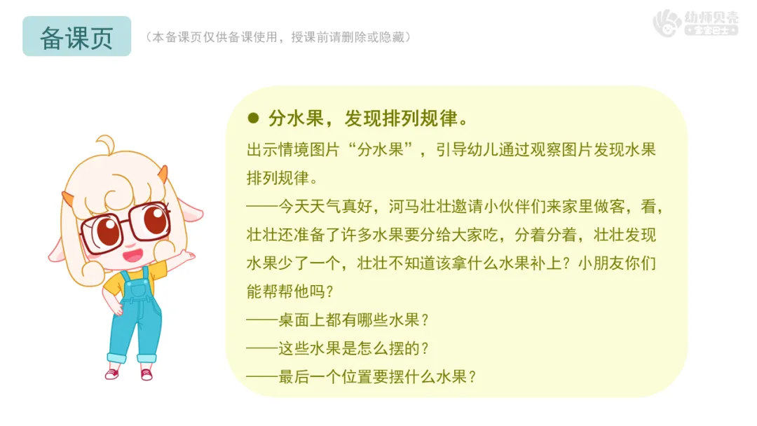 出示情境图片“分水果”,引导幼儿通过观察图片发现水果排列规律。