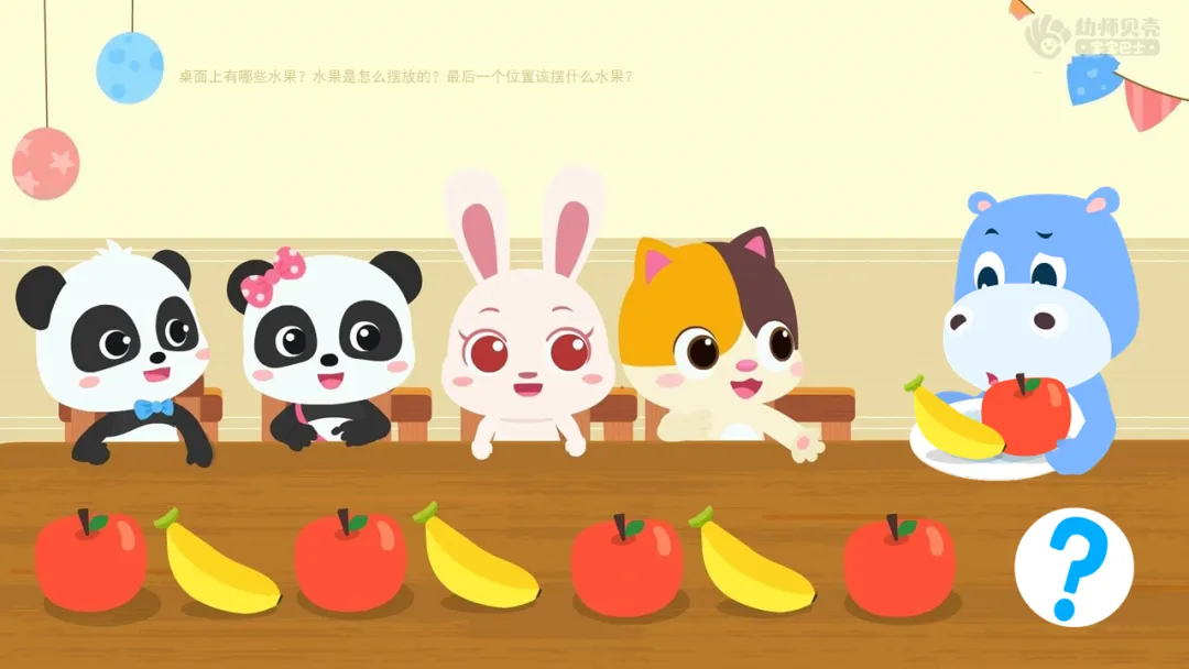 ——今天天气真好,河马壮壮邀请小伙伴们来家里做客,看,壮壮还准备了许多水果要分给大家吃,分着分着,壮壮发现水果少了一个,壮壮不知道该拿什么水果补上?小朋友你们能帮帮他吗?