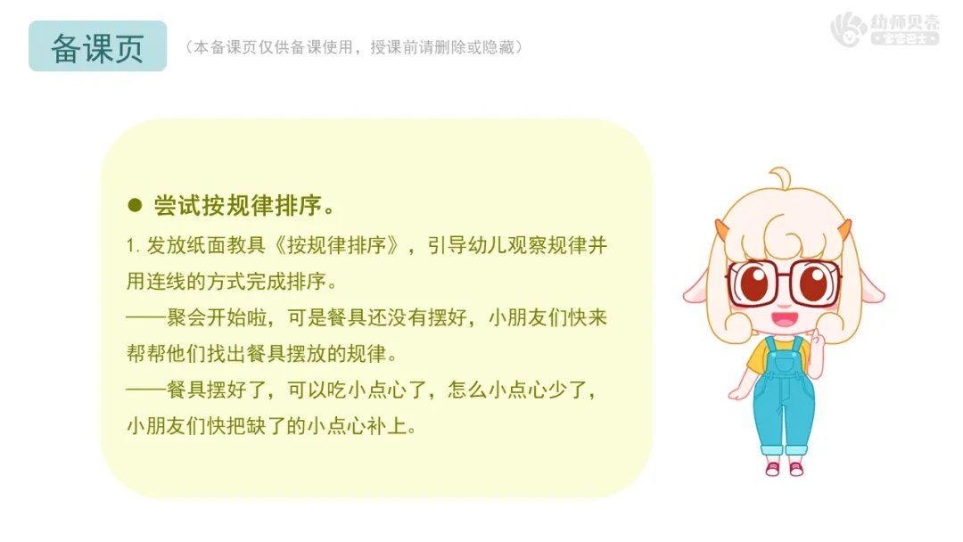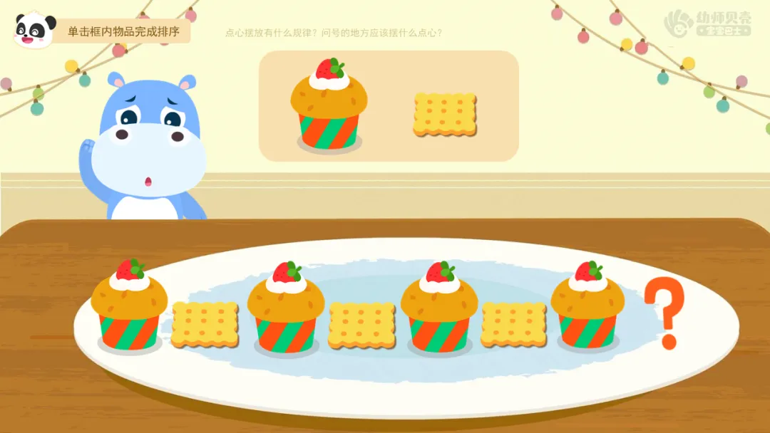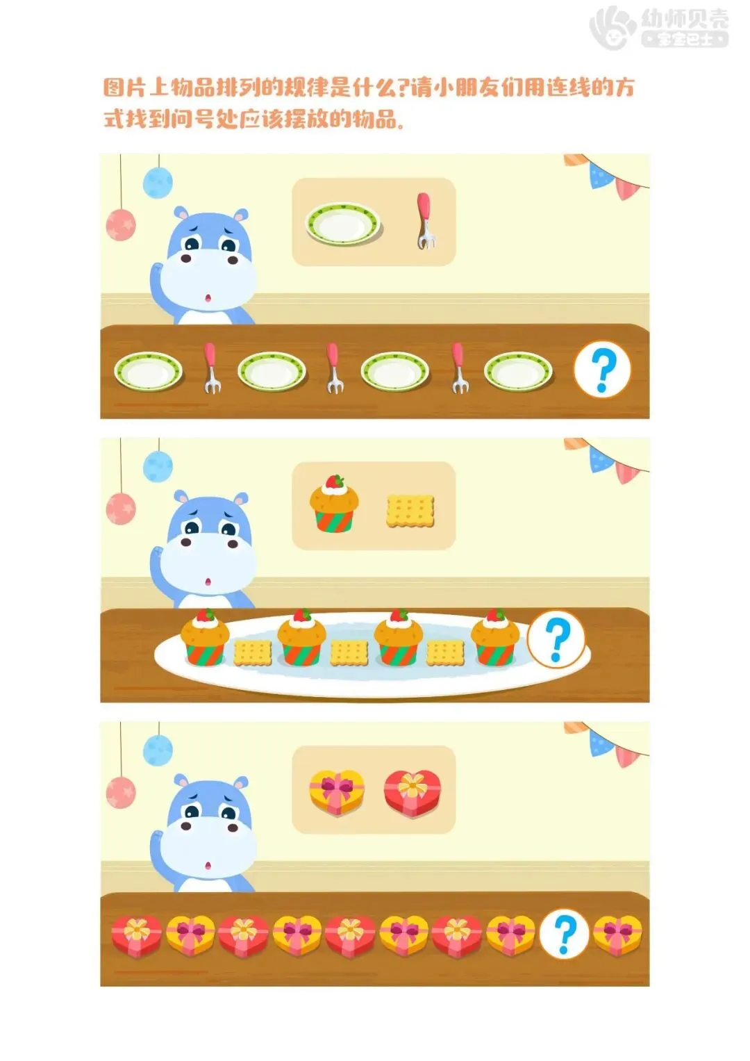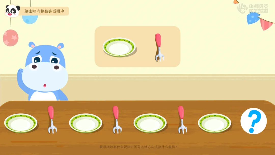 ——聚会开始啦,可是餐具还没有摆好,小朋友们快来帮帮他们找出餐具摆放的规律。