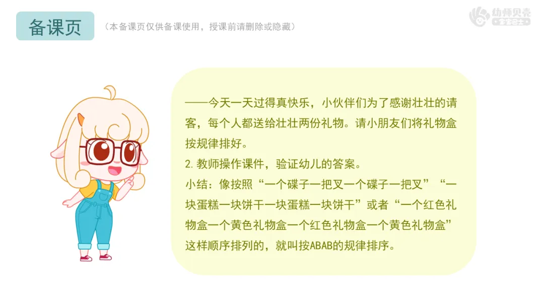小结:像按照“一个碟子一把叉一个碟子一把叉”“一块蛋糕一块饼干一块蛋糕一块饼干”或者“一个红色礼物盒一个黄色礼物盒一个红色礼物盒一个黄色礼物盒”这样顺序排列的,就叫按ABAB的规律排序。