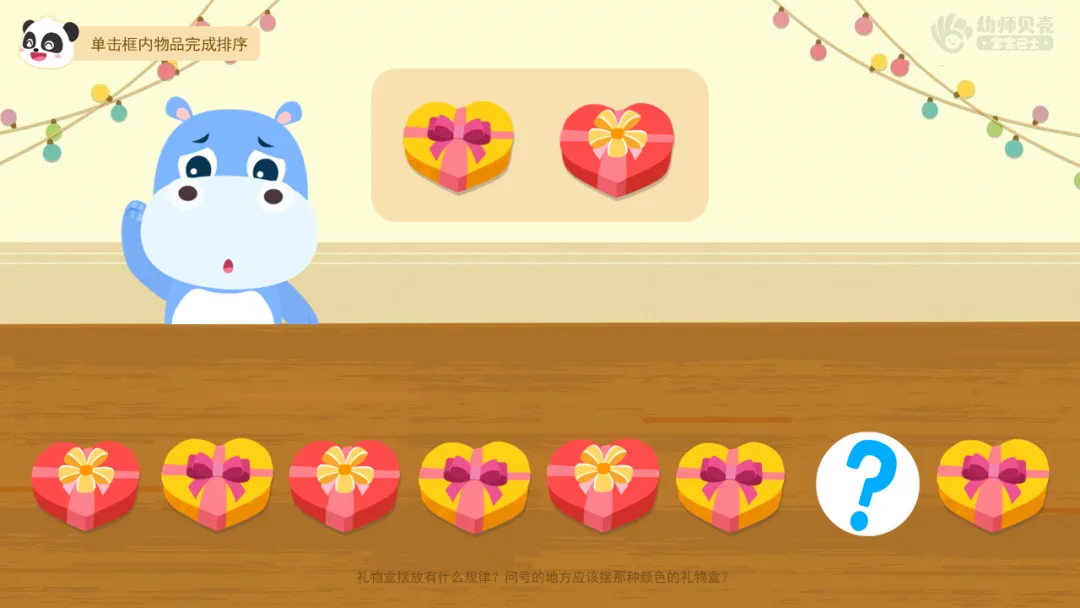 ——今天一天过得真快乐,小伙伴们为了感谢壮壮的请客,每个人都送给壮壮两份礼物。请小朋友们将礼物盒按规律排好。