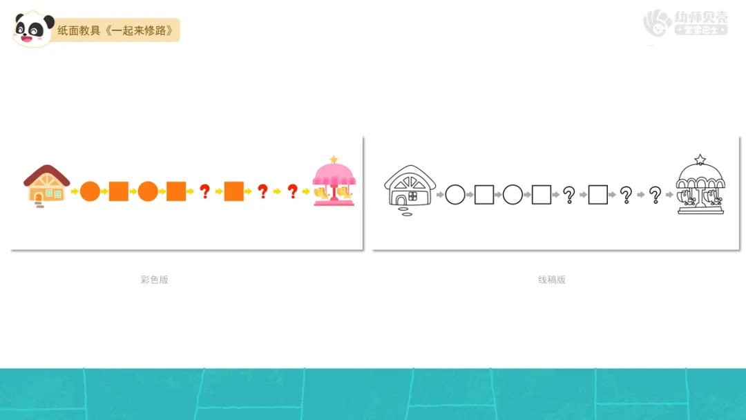 1.发放纸面教具《一起来修路》,幼儿动手按规律排序。
