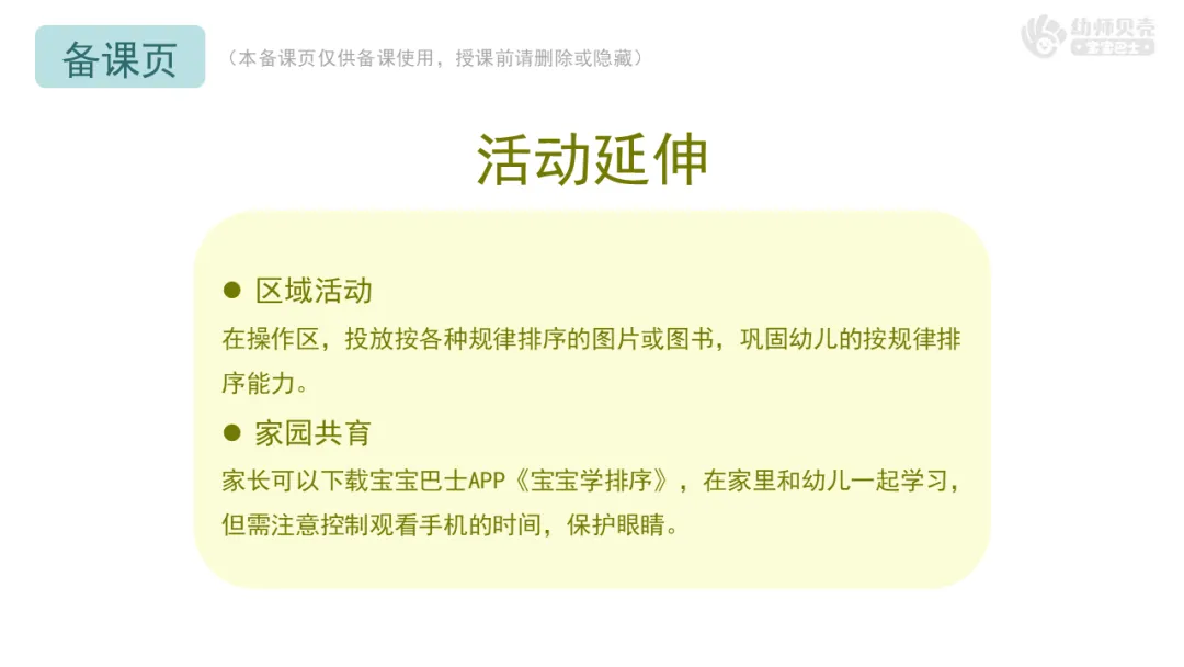 家长可以下载宝宝巴士APP《宝宝学排序》,在家里和幼儿一起学习,但需注意控制观看手机的时间,保护眼睛。