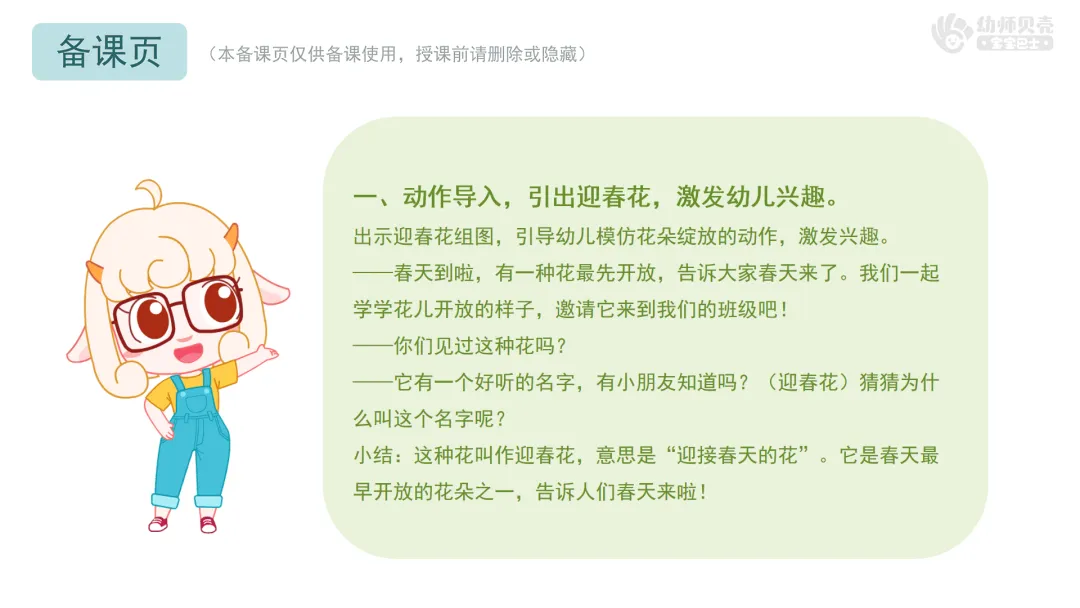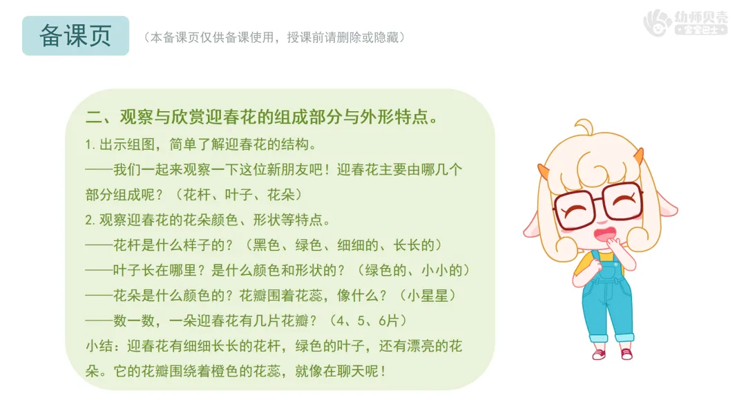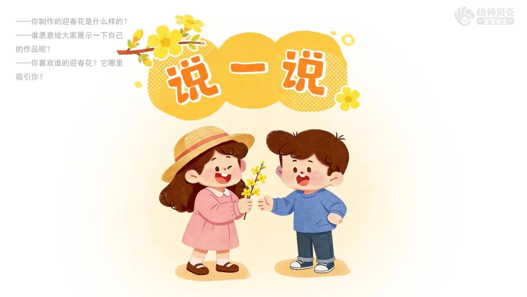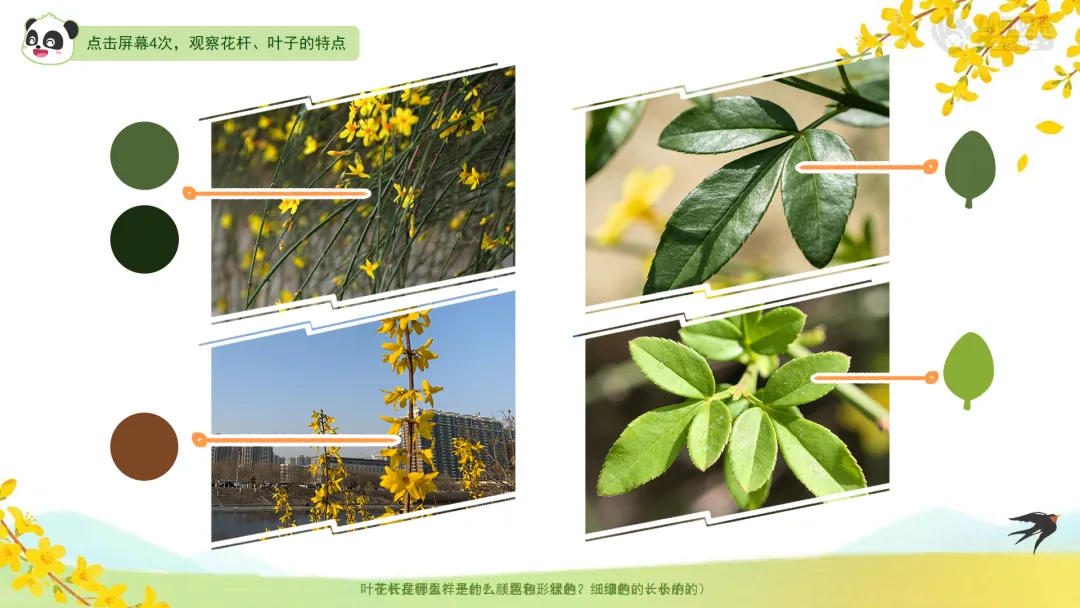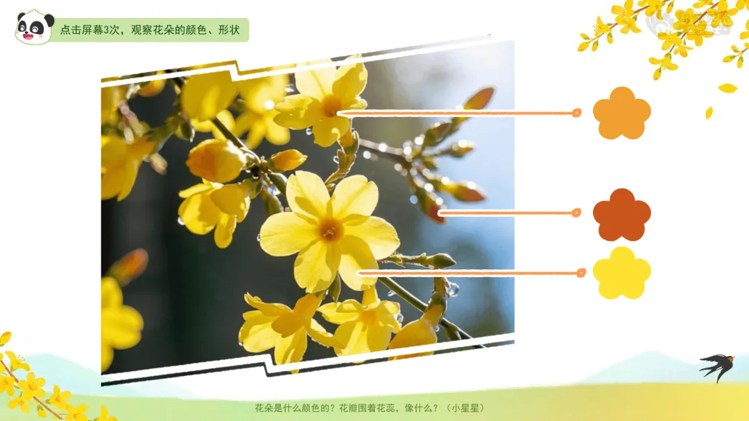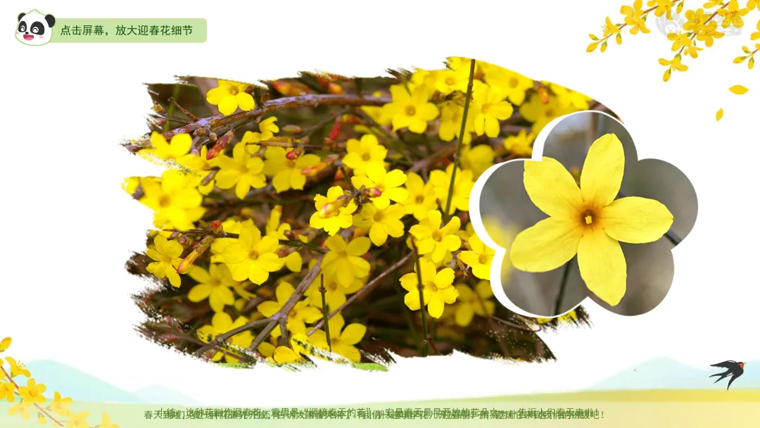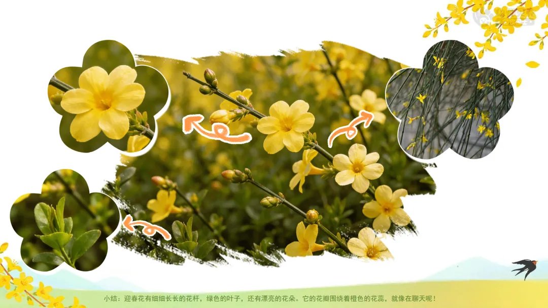 小结:这种花叫作迎春花,意思是“迎接春天的花”。它是春天最早开放的花朵之一,告诉人们春天来啦!