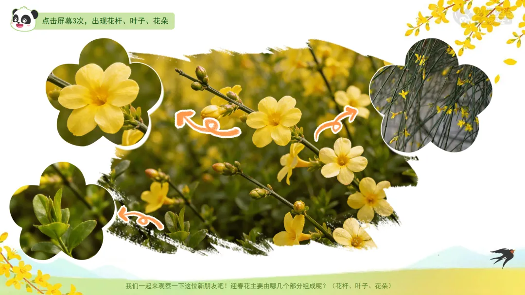 ——我们一起来观察一下这位新朋友吧!迎春花主要由哪几个部分组成呢?(花杆、叶子、花朵)