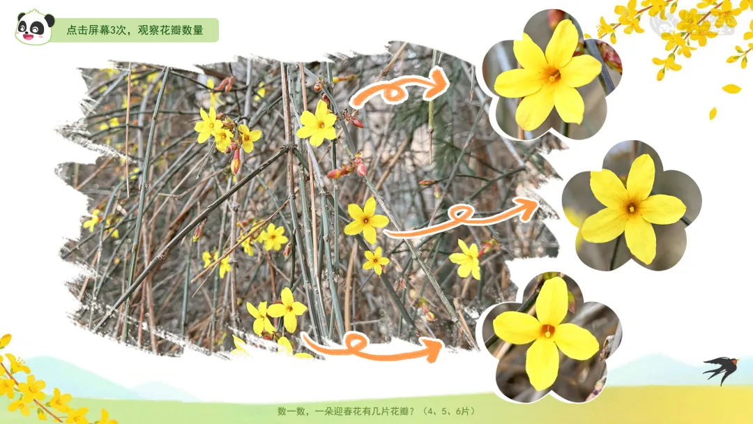 ——数一数,一朵迎春花有几片花瓣?(4、5、6片)