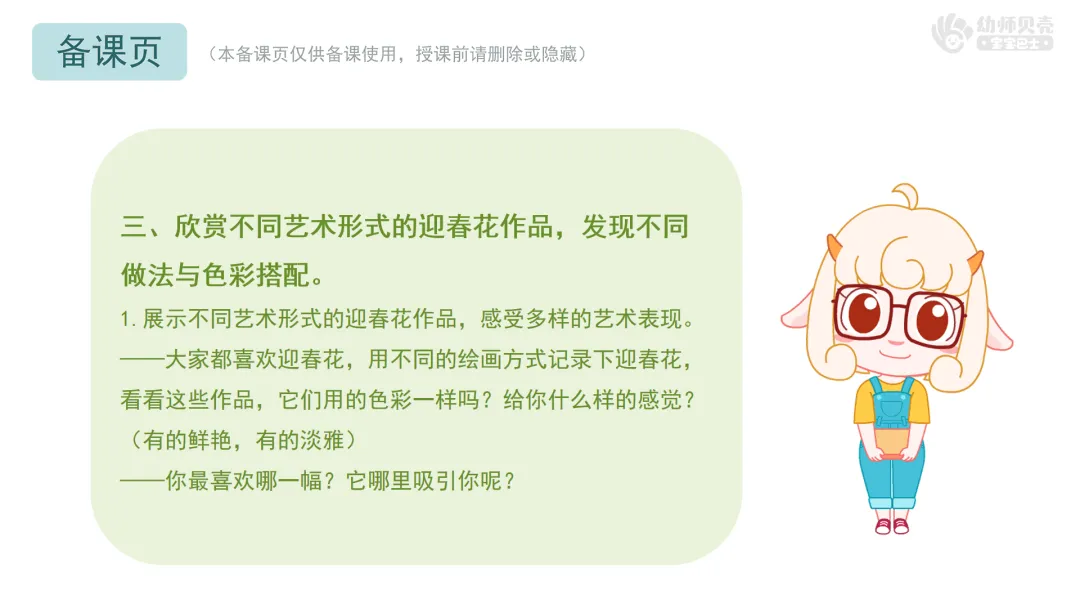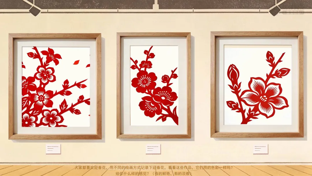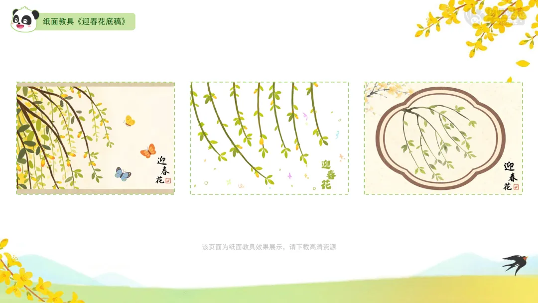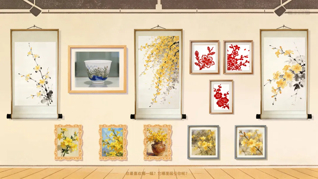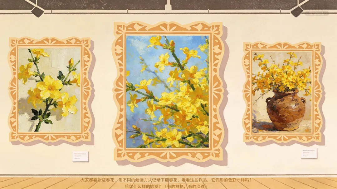 1.展示不同艺术形式的迎春花作品,感受多样的艺术表现。