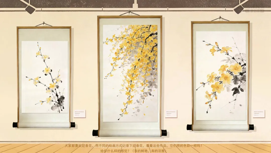 三、欣赏不同艺术形式的迎春花作品,发现不同做法与色彩搭配。