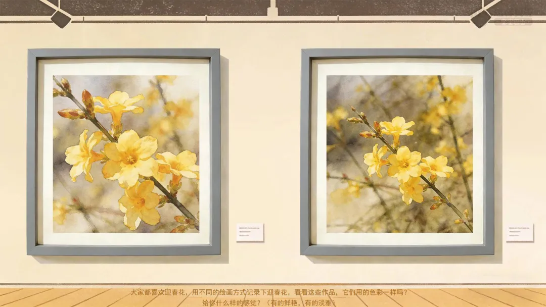 ——大家都喜欢迎春花,用不同的绘画方式记录下迎春花,看看这些作品,它们用的色彩一样吗?给你什么样的感觉?(有的鲜艳,有的淡雅)