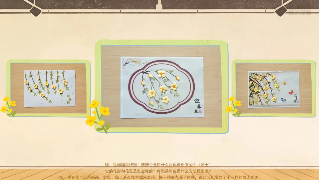 小结:迎春花可以用画画、剪纸、黏土这么多方式来表现。每一种都充满了创意,都让我们看到了不一样的春天之美。