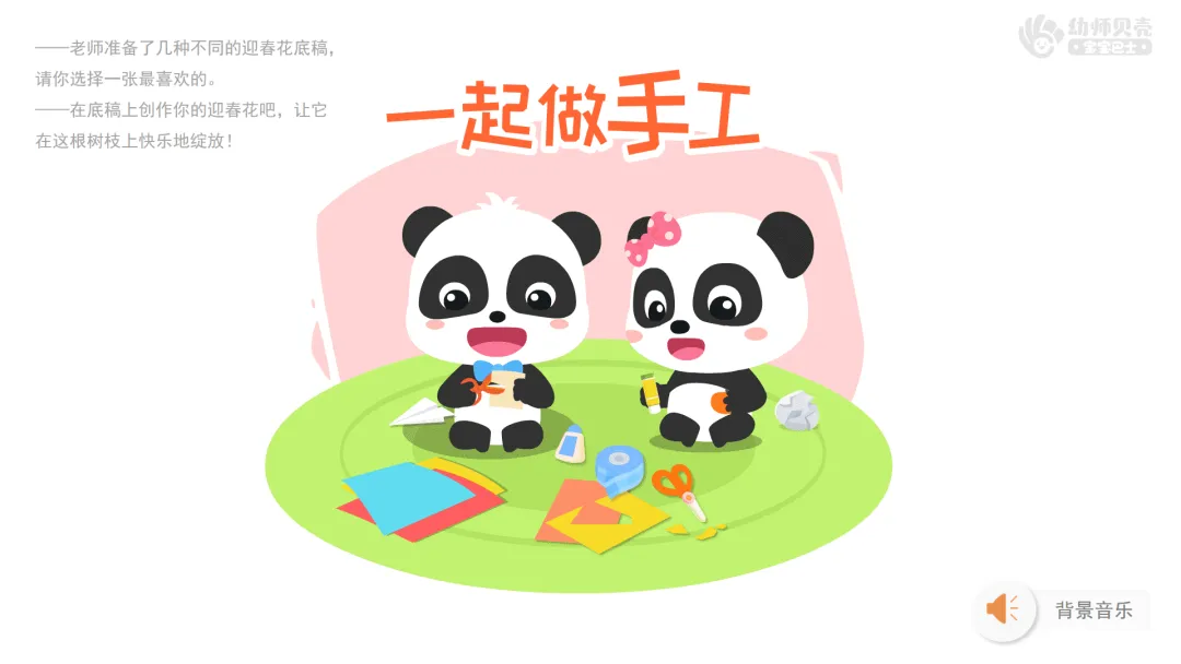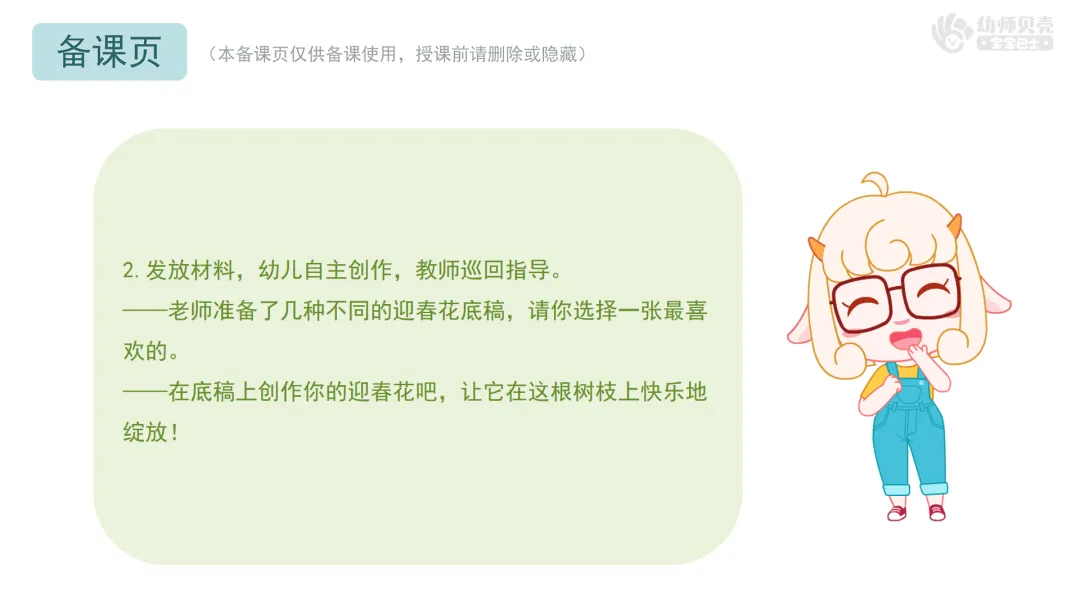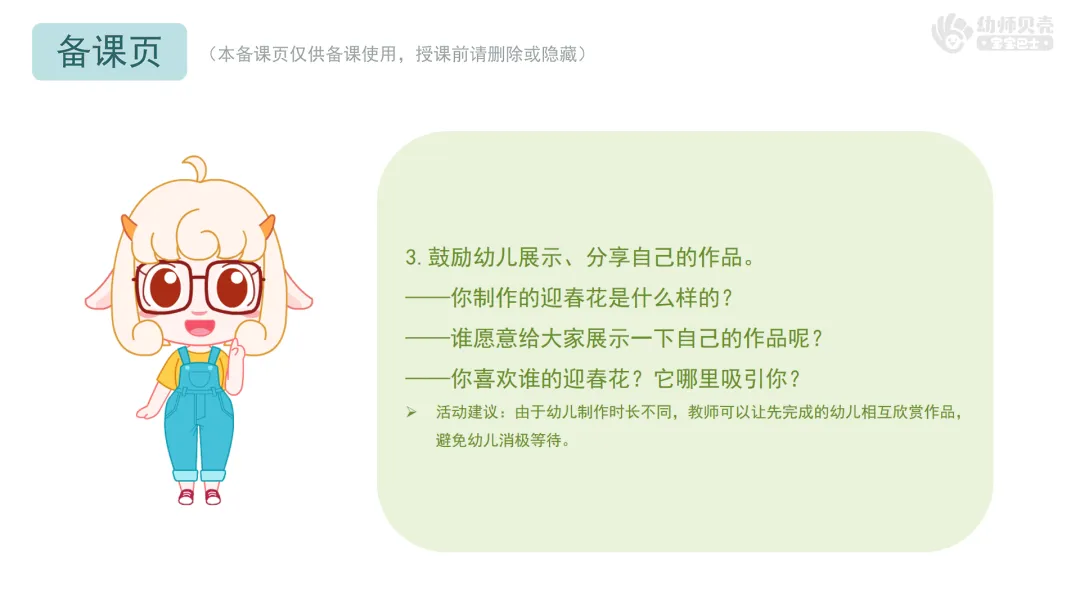 Ø活动建议:由于幼儿制作时长不同,教师可以让先完成的幼儿相互欣赏作品,避免幼儿消极等待。
