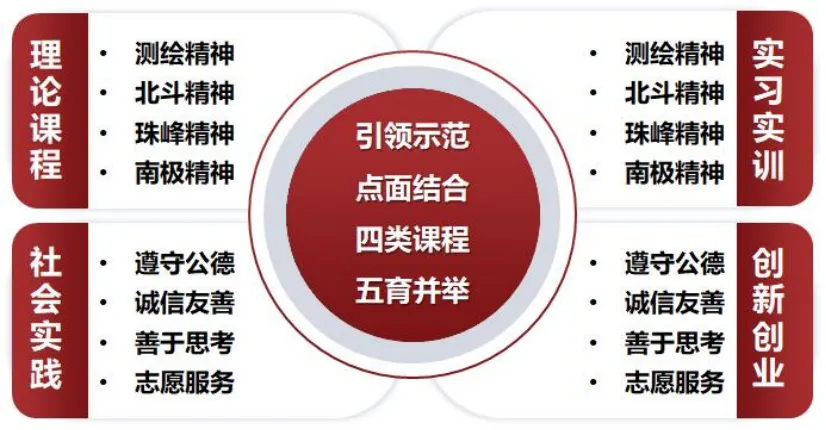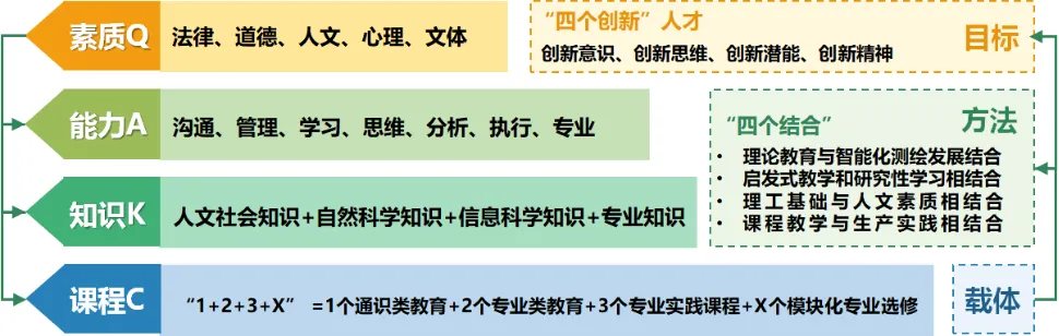 地理信息是新时代赋能国家数字化发展的新思维、新资源、新技术,技术性、产业性、泛在性决定了地理信息强国人才培养的内在逻辑。融合精神元素与专业元素,将KAQ模型发展为S-KAQ模型(精神-知识/能力/素质);融合空天科技、电子、地理科学、计算机等学科构建测绘类专业学科群,在此基础上构建了“1+2+3+X”多学科交叉的课程体系,建立了国家级实习实践平台,建设了国家级虚拟仿真一流课程,形成了“分阶段培养、多层次提升、全方位实训”虚实结合的实践教学体系,满足地理信息强国人才对学习能力、创新能力、实践能力、交流能力、社会适应能力的要求。
