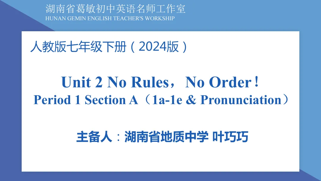 叶巧巧,湖南省地质中学初中英语教师,中学一级教师,中小学教师资格考试面试考官,PETS考官。2015年起就一直深耕教学一线。教学上,曾获长沙市“星城杯”教学竞赛三等奖,湖南省在线集体备课大赛一等奖,多次获得学校各类教学竞赛一等奖,校青年岗位能手,优秀教师,优秀共产党员,教研先进分子,优秀备课组长等。教研上,曾分别作为主持人和核心成员主持和参与省科协课题的研究,均已顺利结题。所写论文曾获省教育学会二等奖和优秀奖。2024年9月获长沙市教育局嘉奖。