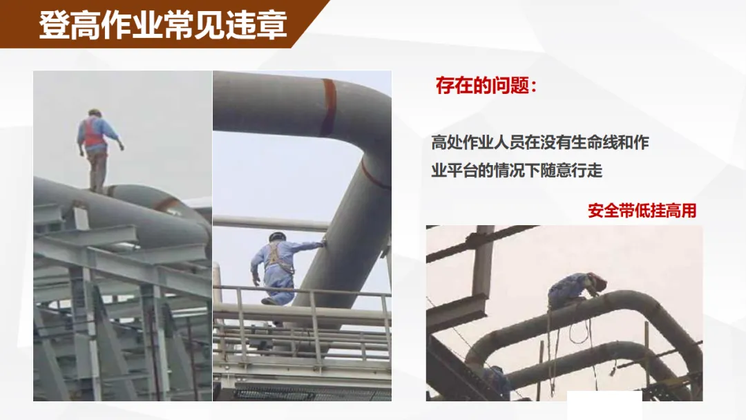 作业人可能会出现违章作业等冒险行为,比如图省事不系安全带,嫌麻烦不做气体检测,赶进度违反能量隔离程序。