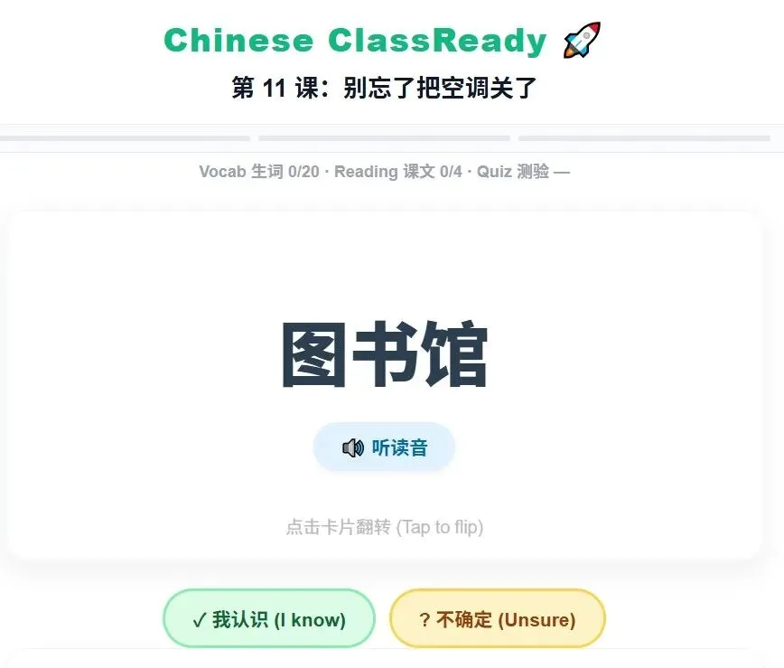 做ClassReady 的起点很朴素:学生整天手机不离手,抱着纸质书预习实在枯燥。我想,如果做一个手机上随时打开的预习网页——生词可以翻转、能点击发音、课文可以开关拼音——是不是就完美了?