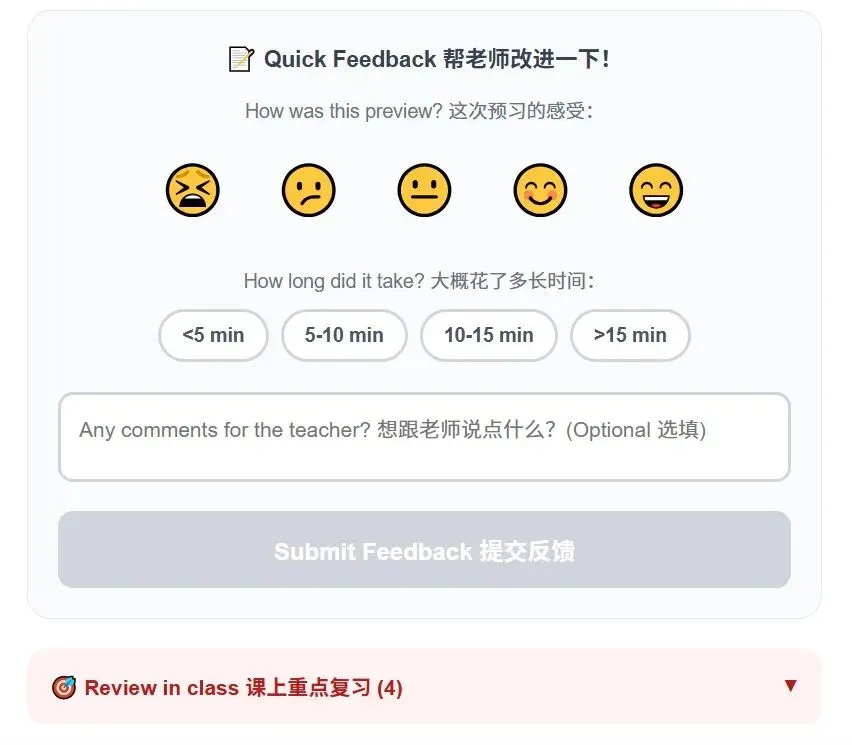 于是我又做了一个很小但很重要的决定:在预习完成页面的成就卡片下方,嵌入一个极简的微反馈。不要求写长文,只需要 3 秒钟: