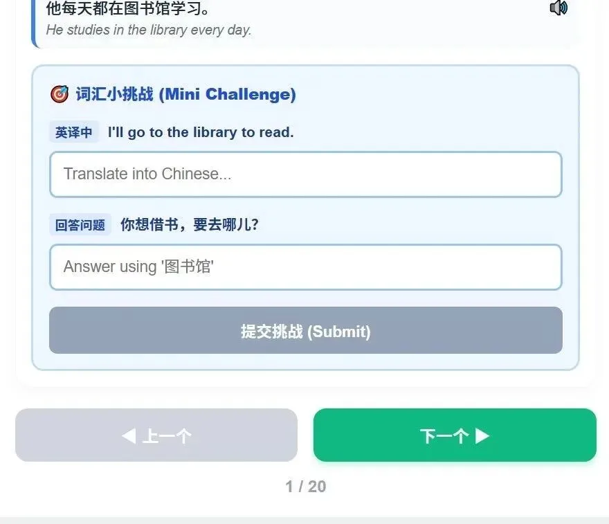 “我正在开发一个基于 Vue 的 HSK 互动预习网页。请在每个生词下方新增一个【词汇小挑战】区域。包含两个输入框:Q1 是英译中造句,Q2 是情境问答(学生须使用该生词作答)。提交后系统自动判断,如果回答里没有包含目标词,温柔提示重新修改。请用‘挑战一下’替代‘诊断测试’,降低学生的防备感。”