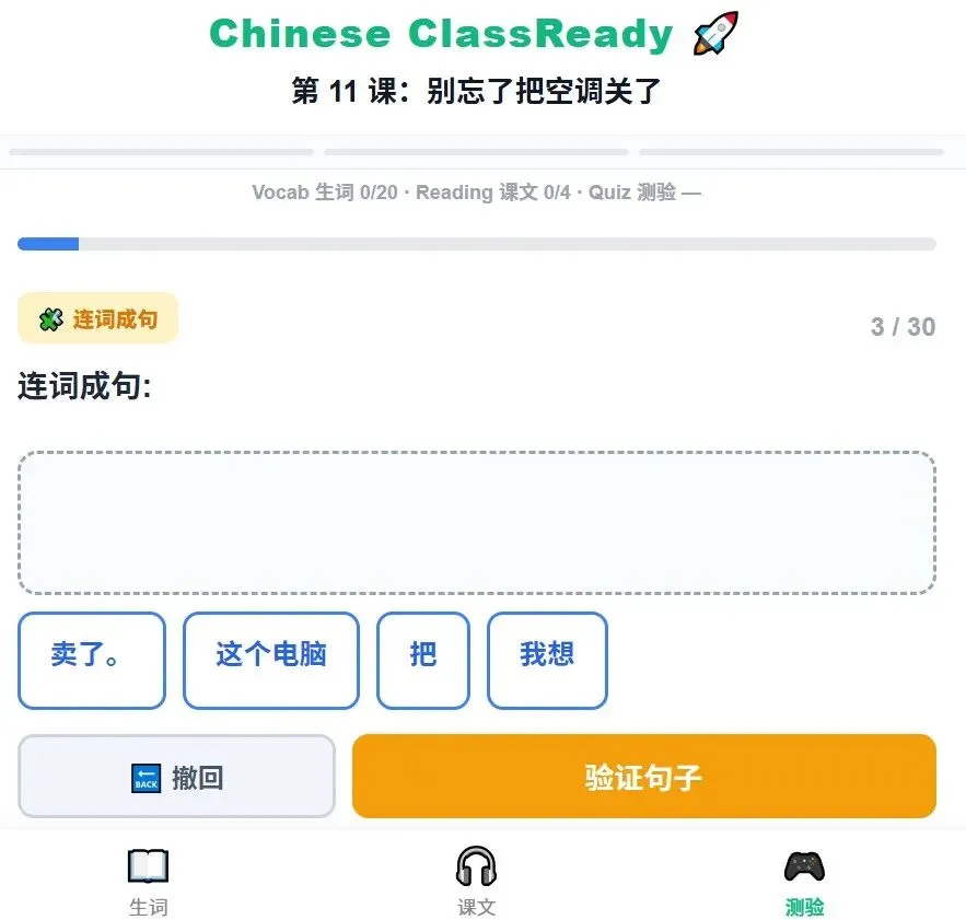 长课文太有压迫感?那就做成手风琴折叠,默认收起,想看哪段点哪段。连词成句容错率太低?那就加一个“撤回”按钮,允许学生退回点错的词。进入页面太像做作业?那就把入口改造成一扇“闯关大门”——一个弹跳的火箭图标、一句充满挑战感的文案,让学生觉得自己不是在被考,而是在玩。