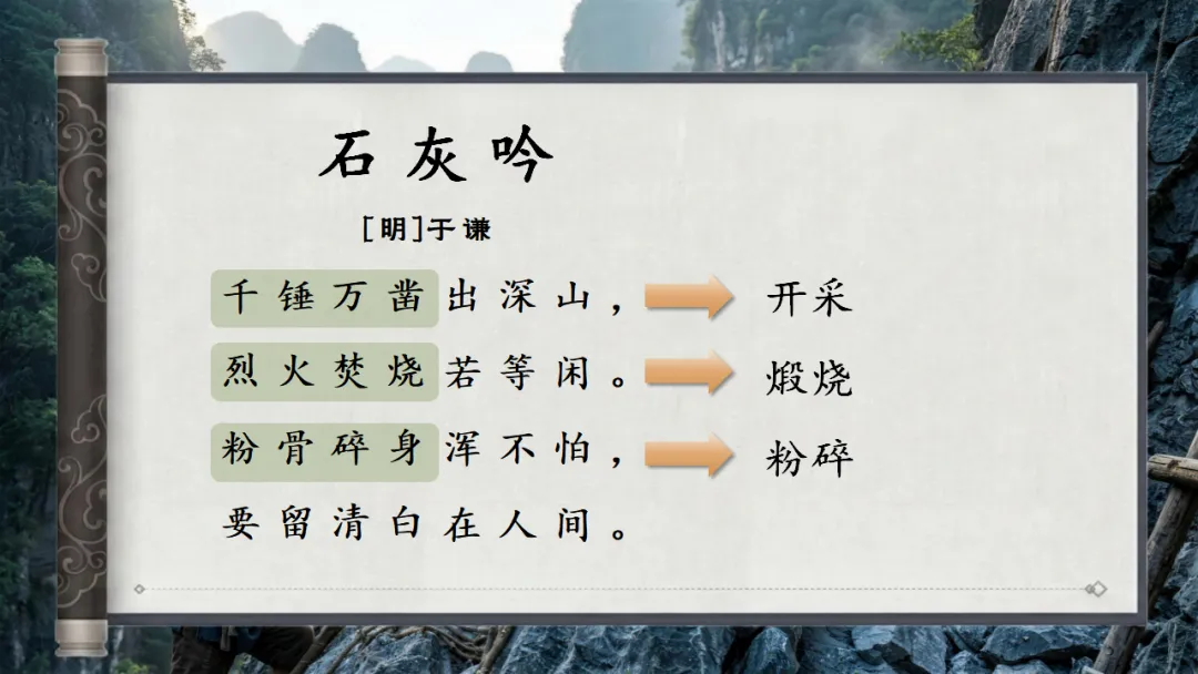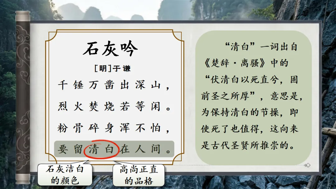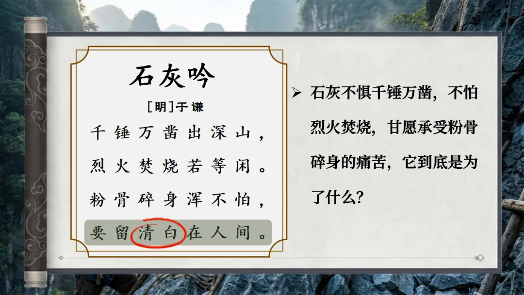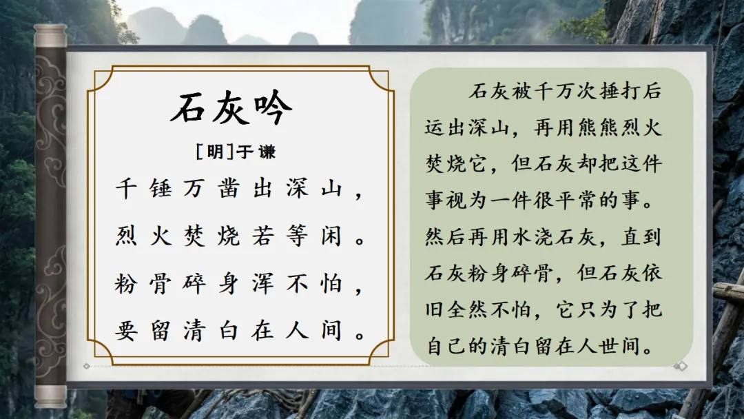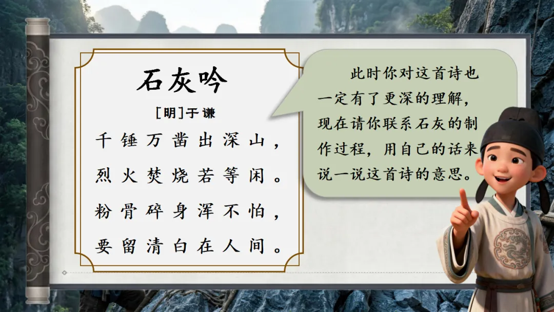>六下古诗三首《石灰吟》AI赋能课件 | 以石灰明心立志,以正气传世留名(课件+AI视频+教案)