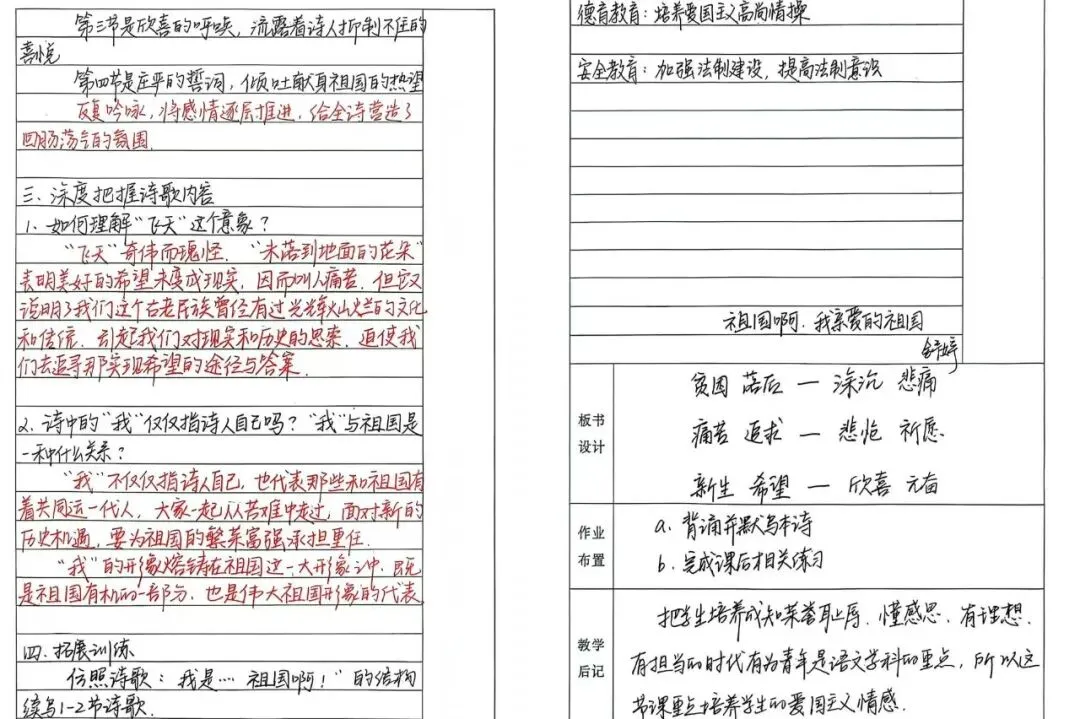 九年级语文颜晨老师的《祖国啊,我亲爱的祖国》教案,以诵读与探究为核心,引导学生品味意象、触摸情感脉络。从“神话的蛛网”到“伤痕累累的母亲”,层层拆解诗意,在反复吟咏中唤醒家国情怀,板书清晰、拓展走心,尽显语文课堂的温度与力量。