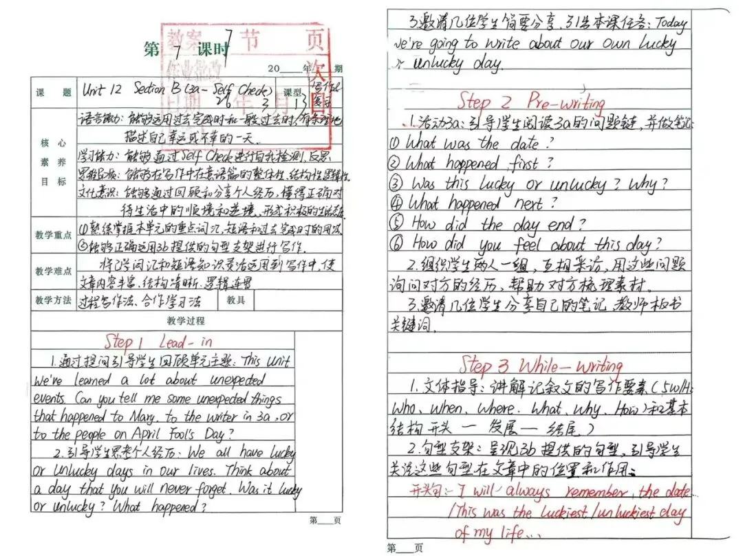 九年级英语蒋玲芳老师的《Unit 12 Section B》写作课教案,以“幸运/不幸的一天”为主题,从导入、预写、写作到评价环环相扣。通过5W1H写作框架、时态点拨和范文引路,层层拆解记叙文写作逻辑,既夯实语言知识,又引导学生从容面对生活顺境逆境,尽显扎实的教学功底与育人温度。