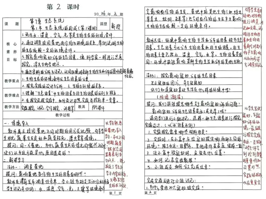 七年级生物周艳梅老师的《生态系统的构成》教案,以校园菜地情境导入,通过菜地调查+鼠妇分布探究两大活动,引导学生自主构建生态因素概念。课堂注重实验设计与变量控制,将抽象知识生活化,既培养科学探究思维,又渗透热爱自然的生命教育。