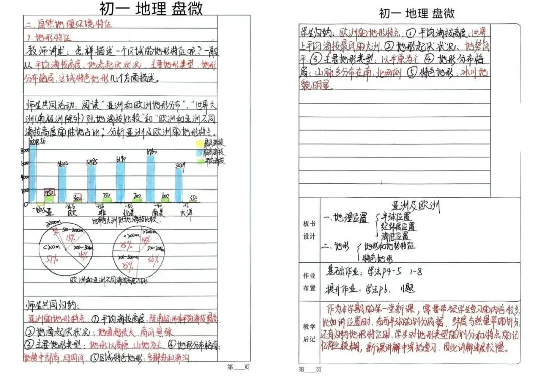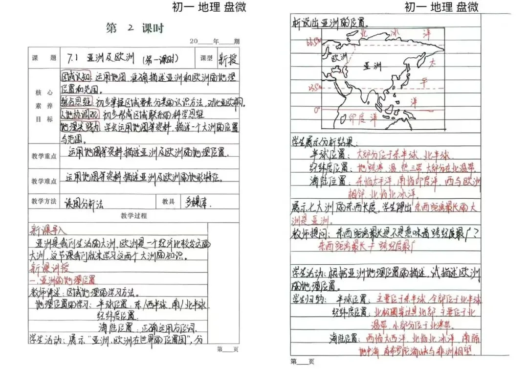 七年级地理盘微老师备课细致入微,既注重授人以渔,教学生从多维度分析大洲位置与地形,又巧用地图、图表等直观材料,贴合初一学生认知规律。课堂上以学生展示、师生共归纳的形式激活参与,还在课后精准记录学情、兼顾旧知复习,尽显对学生的负责与教学巧思。