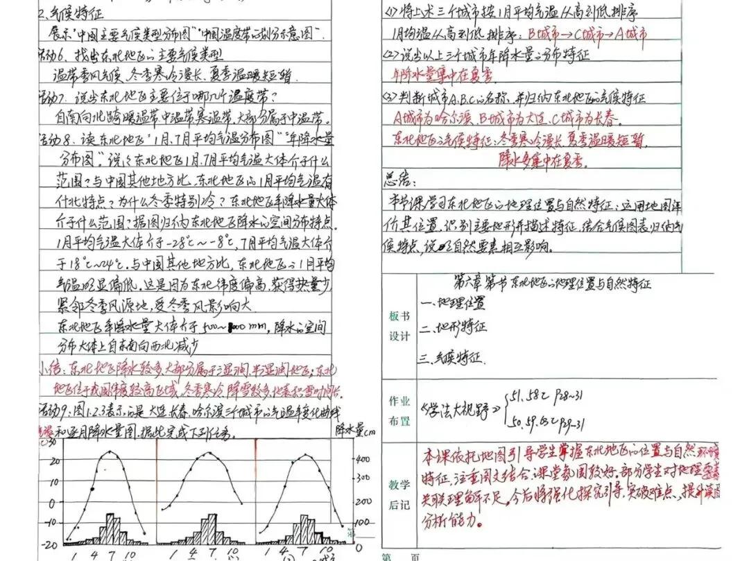 八年级地理潘开军老师以“白山黑水”短视频导入,从地理位置、地形、气候三方面引导学生分析东北地区自然特征。课堂依托地图和图表,注重培养学生读图分析与要素关联思维,作业分层布置,课后还精准记录学情,教学扎实细致。
