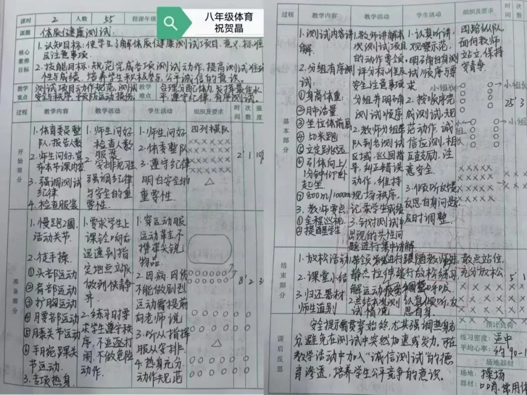 这是一节八年级体质健康测试体育课,面向55名学生。祝贺晶老师这节课以规范完成身高体重、肺活量、坐位体前屈等测试项目为核心,通过热身、分组有序测试、放松总结等环节,培养学生公平诚信的意识,提升测试准确性,同时强调安全与纪律,帮助学生了解自身体质状况。