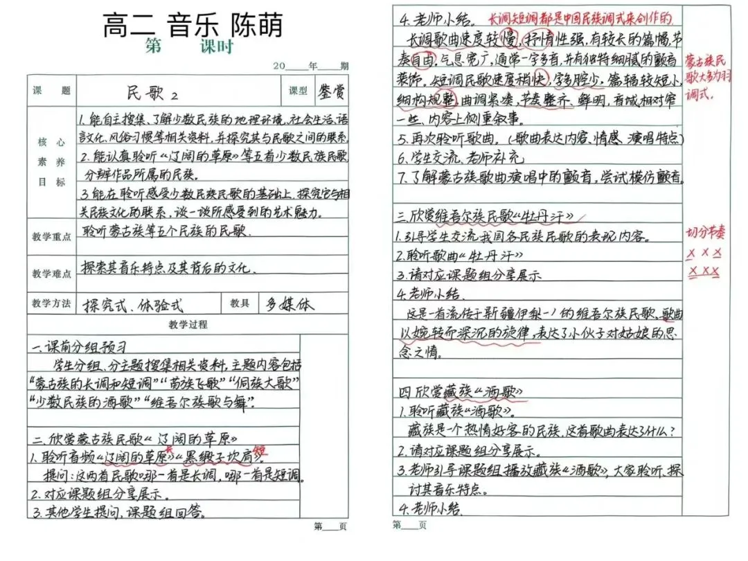 陈萌老师是我校高二音乐教师,专注民歌鉴赏教学。在《民歌2》一课中,她采用探究式、体验式教学,引导学生分组搜集少数民族民歌资料,通过聆听《辽阔的草原》《牡丹汗》等作品,感受不同民族音乐特点与文化内涵,让学生在歌唱体验中领略多元民族音乐的魅力。