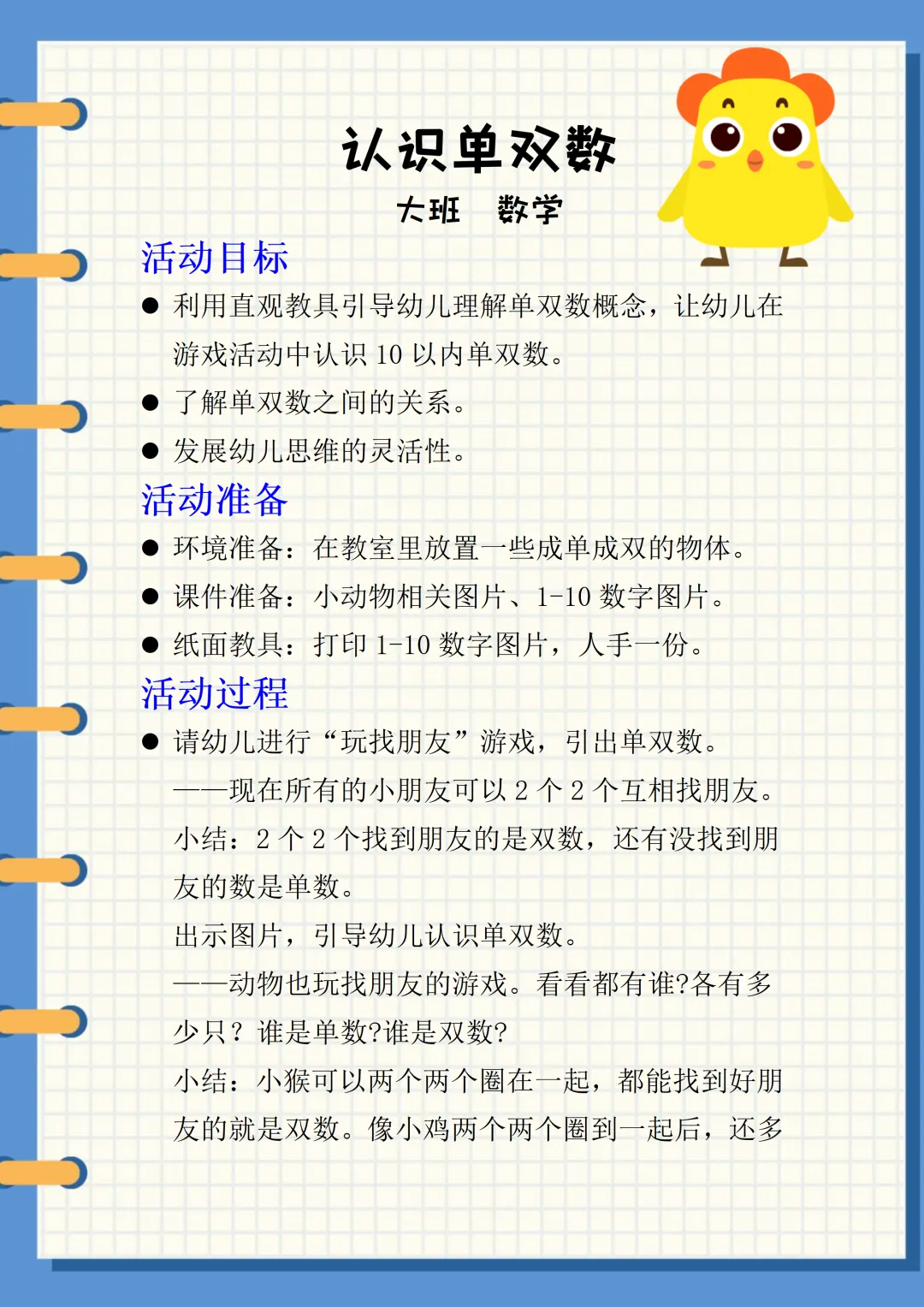 活动目标:利用直观教具引导幼儿理解单双数概念,让幼儿在游戏活动中认识10以内单双数。