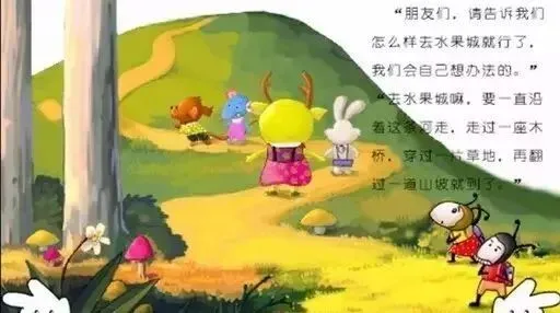二.欣赏故事,了解故事内容 活动一:(B.点击动画2,播放故事录音到......怎么过河呢?) 1.(1)师:小蚂蚁来到小河边遇到了什么困难啊?这可怎么办呀,小朋友快帮小蚂蚁想想办法吧!(师:我们来看看河边有哪些东西可以帮小蚂蚁过河呢?) (2)a(如幼:小鸭)师:小鸭怎么帮两只小蚂蚁过河呢?(幼:把他们背过去)(师引导幼儿拖动小鸭,边说边做)师:你来试试! 小结:小鸭背着小蚂蚁过河,真是个好办法!还有什么不一样的办法吗? b(如幼:花生壳)师:花生壳怎么过河呢,你也来试试!(师引导幼儿拖动花生壳,边说边做) 小结:小蚂蚁把花生壳当成了什么呀?(幼:小蚂蚁把花生壳当成了小船,划过了河)也是一个好办法!还有什么不一样的好办法呢? c(如:树叶)师:树叶怎么帮小蚂蚁过河?(幼:把小树叶当做小船过河),那你再来试试吧!(师引导幼儿拖动树叶,边说边做)谢谢小树叶 2.(1)师:小朋友们想的办法真好!小蚂蚁也和小朋友一样,很爱动脑筋,小蚂蚁会想出什么好办法呢?一起来看看! (C.点击动画3,播放录音到...河对岸,眼前是一眼也望不到边的大草地) (2)小结:小蚂蚁过河吗?小蚂蚁用了什么办法过河的啊?(幼:它们是把树叶当作小船划过了河) 小结:爱动脑筋的小蚂蚁把树叶当作小船划过了河,他们要继续赶路了(D.播放动画…怎么办呢?) 活动二:1.(1)师:小蚂蚁来到了一大片....(幼:草地)它们很想快点到达水果城,小蚂蚁应该怎么样快速过草地? (2)小结:小朋友们想的办法真不错!小蚂蚁是用什么办法过草地的呢?我们一起来看一看!(D.点击动画4,播放录音到...带离了大草地) (3)师:小蚂蚁通过大草地了吗?小蚂蚁刚才用了什么办法过草地的呀?(幼:用气球,风婆婆吹)(师引导幼儿把话说完整:小蚂蚁是请风婆婆帮忙,将气球吹起来的)小蚂蚁真的很聪明哦,我们小朋友也很棒!我们夸夸自己吧! 活动三:(1)师:去水果城的路上真是困难重重啊,你们猜接下来小蚂蚁有没有到水果城呢?(E.点击画面5,播放录音到...当然就能进来了!) (2)师:小蚂蚁进入水果城了吗?为什么进不去!老爷爷除了一道什么题目?怎么让脚不碰到地毯就能过去呢?老师这儿正好有毯子,一起来试试有什么好办法!(幼儿自由实践,师指导) (3)师:刚才你们都用了什么办法过毯子的呀?(如:有幼儿跳过去,师:小蚂蚁那么小能跳过去吗?我们再来看看其它的办法)小蚂蚁能通过老爷爷的考验吗?(G:点击动画6,卷毯子播放动画录音到最后)(动画显示关门) (4)师:小蚂蚁终于进入水果城了,太了不起了!小蚂蚁怎么过毯子的啊?(幼:把毯子卷起来跨过去)师:小蚂蚁见到水果可开心了,你们开心吗? 三、结束部分 1.师:那你们想不想再看一遍小蚂蚁是怎么来到水果城的?(播放完整动画) 小结:看了动画片,你们告诉老师故事里的小蚂蚁你喜不喜欢?你喜欢它什么呢?我们小朋友们和小蚂蚁一样爱动脑筋,老师也很喜欢你们!回去以后,我们把两只小蚂蚁的故事也告诉别的小朋友,好不好? (活动结束,再见!)- END -