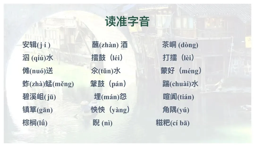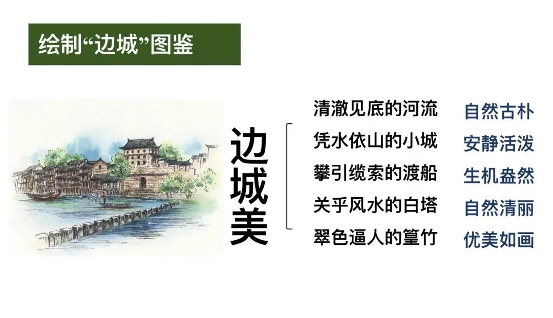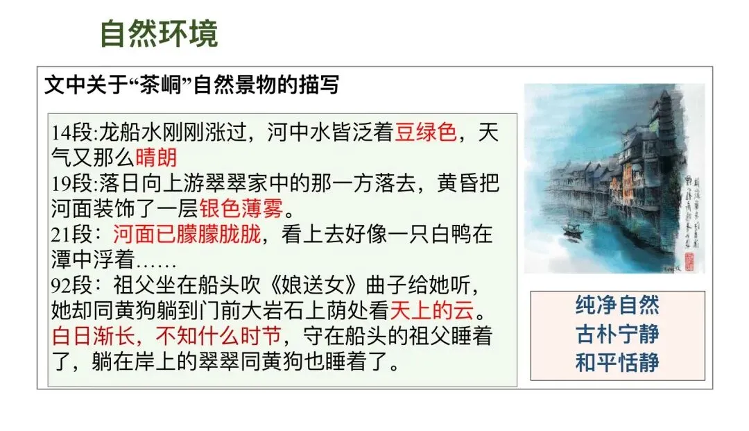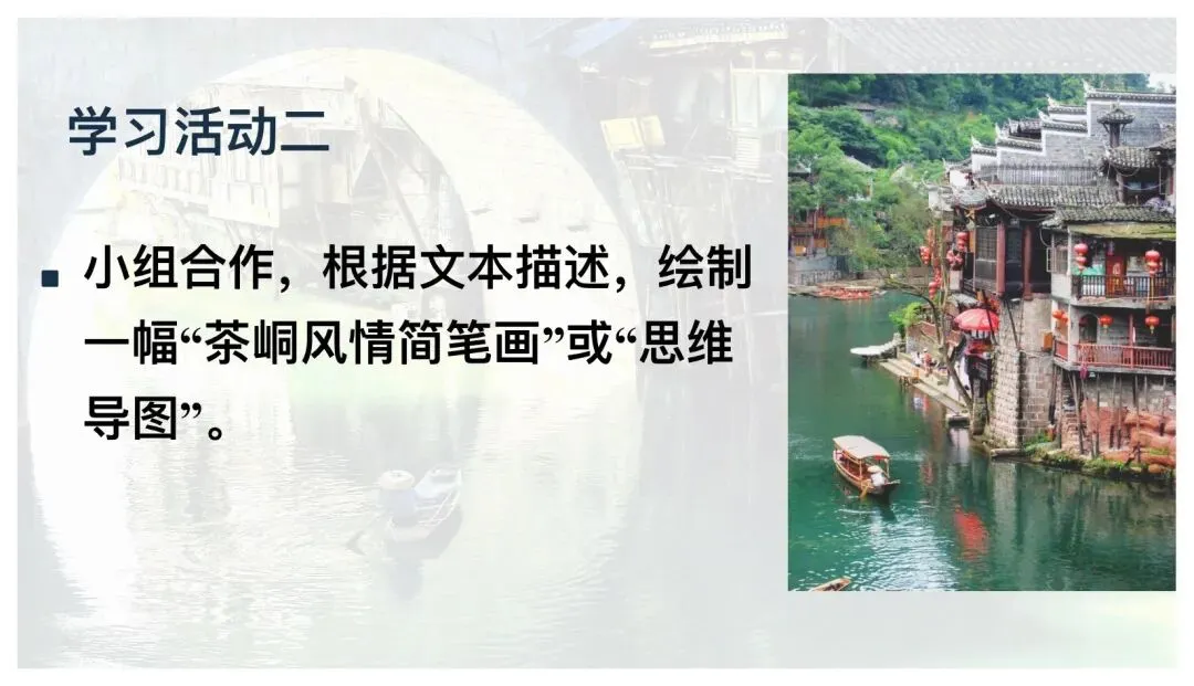 设计意图:通过图文转换,直观感受边城风景的“清丽、静谧”,为理解“桃花源”般的生存环境做铺垫。