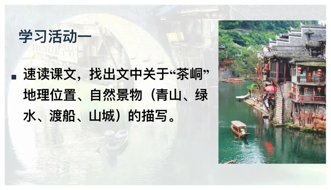 活动1:学生速读课文,找出文中关于“茶峒”地理位置、自然景物(白塔、溪流、渡船、山城)的描写。