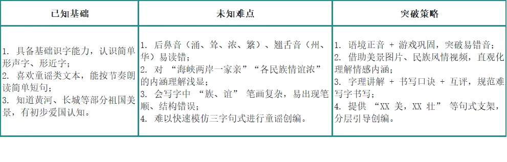 文本定位:本文是一首朗朗上口的三字童谣,以简洁明快的语言勾勒神州大地的壮美山河,诉说两岸同胞的血脉亲情和各民族的团结情谊,是落实文化自信「爱国教育」的核心文本,契合新课标低年级 “积累中华优秀传统文化童谣,培养爱祖国、爱民族的情感” 要求。① 识字写字:重点突破后鼻音 / 翘舌音生字,掌握形声字、形近字识字方法,规范书写 8 个会写字;② 朗读能力:读准童谣节奏,读出不同小节的情感(赞美、雄伟、深情、奋进);③ 积累运用:积累 “山川美、情谊浓、齐奋发、共繁荣” 等四字短语,模仿童谣句式创编;④ 价值渗透:感受祖国山河之美,理解台湾是祖国不可分割的一部分,体会各民族团结的意义,树立爱国情怀。文本特点:三字句式、韵律感强,插图直观呈现祖国美景,适合 “情境教学 + 可视化感知 + 朗读积累”。2. 学情精准画像(规避教学盲区)