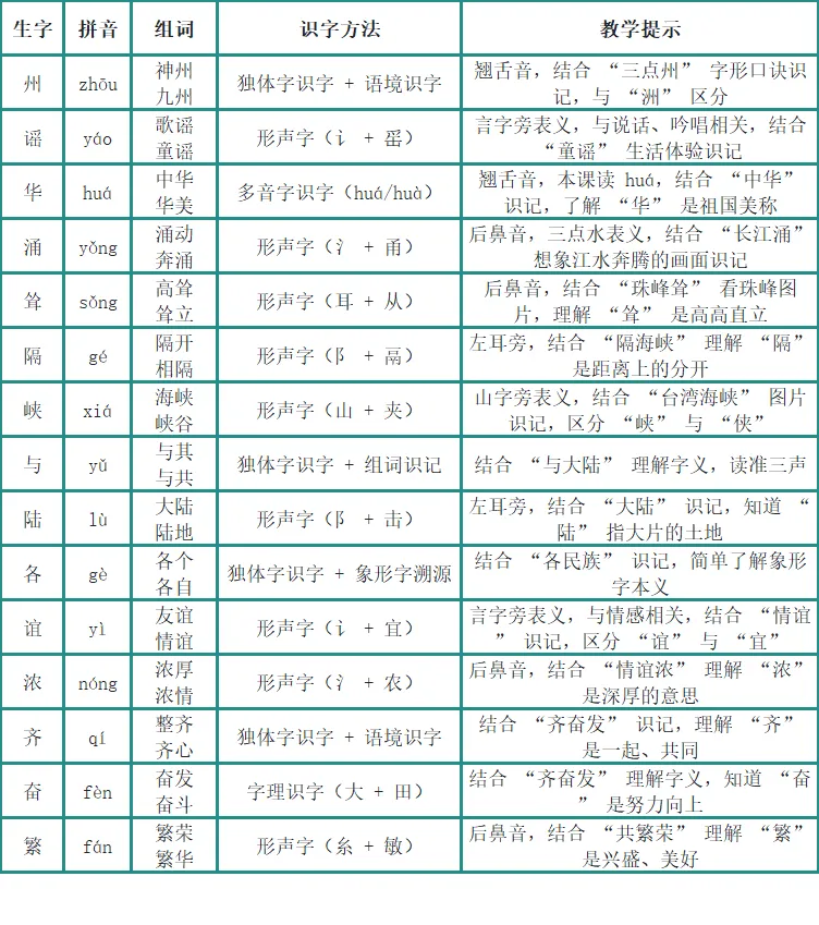 出示易错音卡片:zhōu(州)、huá(华)、yǒng(涌)、sǒng(耸)、nóng(浓)、fán(繁),采用 “指名读 + 开火车读 + 全班齐读” 的方式正音,结合句子 “华(huá)夏儿女爱神州,珠峰耸(sǒng),长江涌(yǒng)” 巩固读音。① 形声字归类:谣、涌、耸、峡、隔、谊、浓、繁(形旁表义,声旁表音),分组认读,说说 “形旁和字义的关系”;② 独体字 / 形近字识字:州、华、与、各、齐、奋,结合字形口诀、图片识记,如 “州” 的 “三点州” 口诀,“奋” 的 “大 + 田 = 努力干活” 字理;③ 多音字识记:华(huá 中华 /huà 华山),结合语境区分读音。玩法:美景识字大闯关—— 出示黄河、珠峰、海峡等图片,图片旁贴对应生字(涌、耸、峡、隔),学生看到图片快速认读生字,读对即可 “闯关成功”。3. 初读课文,整体感知(10 分钟)