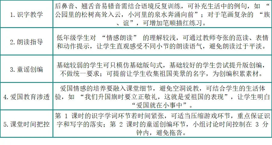 环节 1:精读第 3 小节,体会两岸亲情(5 分钟)① 出示台湾岛与大陆的地图图片,指名朗读第 3 小节,引导学生理解 “隔海峡、是一家” 的含义:台湾岛虽与大陆隔了一道海峡,但自古以来是祖国不可分割的一部分,两岸人民是一家人;② 指导朗读:语气要深情、温柔,读出对台湾岛的牵挂,重音落在 “是一家” 上,采用 “指名读 + 全班齐读” 的方式。环节 2:精读第 4 小节,理解民族团结(6 分钟)① 播放 56 个民族的风情短视频,提问:“我们国家有多少个民族?各民族之间的感情怎么样?” 引导学生理解 “情谊浓”;② 结合 “齐奋发,共繁荣”,提问:“各民族同胞要一起做什么?” 引导学生明白:各民族齐心协力、努力奋斗,让祖国变得更加兴盛美好;③ 指导朗读:读出奋发向上、充满希望的气势,重音落在 “浓、齐、共” 上,全班起立朗读,读出决心。① 教师标注停顿和情感提示,范读全文:“我 / 神州,称 / 中华,山川美,/ 可入画(自豪);黄河 / 奔,长江 / 涌,长城 / 长,珠峰 / 耸(雄伟)……”;② 学生配乐朗读,采用 “男女生对读 + 拍手齐读” 的方式,读出童谣的韵律美和不同小节的情感。3. 背诵积累,拓展创编(12 分钟)