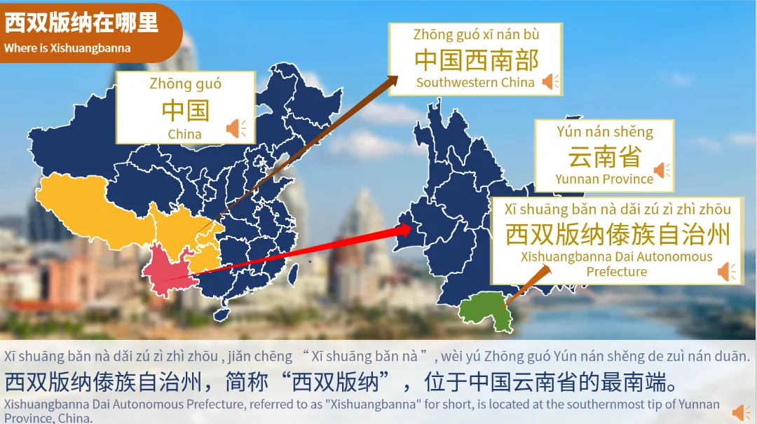 通过中英文对照的讲解,让学生对西双版纳的地理位置有一个直观的认识,为后续的学习奠定基础。