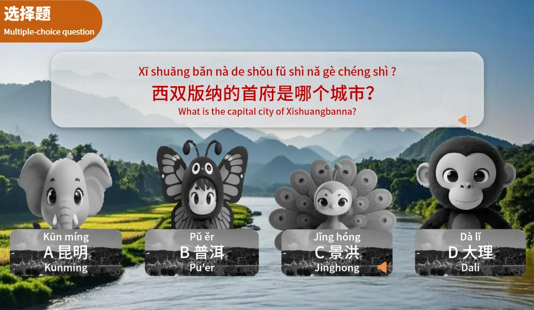 为了帮助学生巩固所学知识,课件设计了多种题型。选择题中,学生 需要选择西双版纳的首府是哪个城市,在昆明、普洱、景洪和大理中做出正确选择。