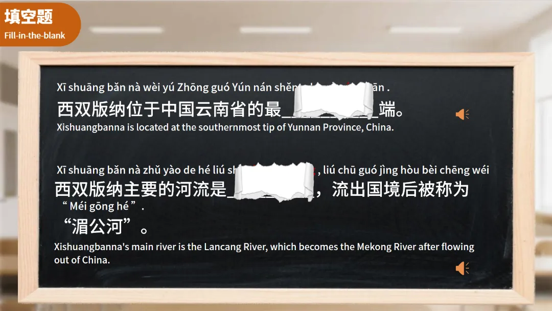 填空题则考查学生对西双版纳地理位置和主要河流的掌握,让学生填写云南省的最什么端以及主要河流名称。