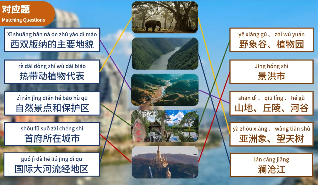 对应题更是将西双版纳的主要地貌、热带动植物代表、自然景点和保护区等与相应的图片和名称进行匹配,全面检验学生的学习效果。